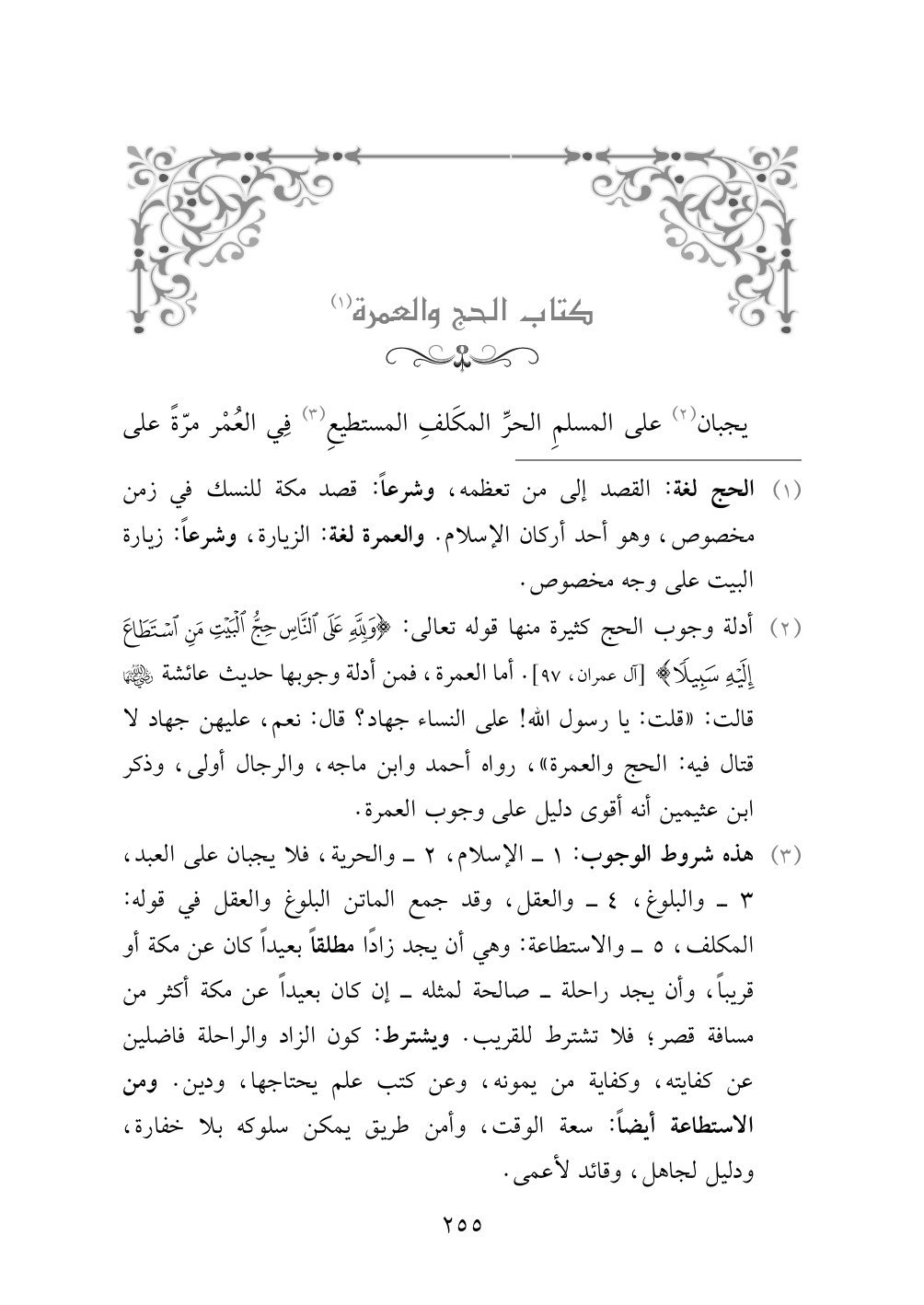 (¬٢) أدلة وجوب الحج كثيرة منها قوله تعالى: {وَلِلَّهِ عَلَى النَّاسِ حِجُّ الْبَيْتِ مَنِ اسْتَطَاعَ إِلَيْهِ سَبِيلًا} [آل عمران، ٩٧]. أما العمرة، فمن أدلة وجوبها حديث عائشة رضي الله عنها قالت: «قلت: يا رسول الله! على النساء جهاد؟ قال: نعم، عليهن جهاد لا قتال فيه: الحج والعمرة»، رواه أحمد وابن ماجه، والرجال أولى، وذكر ابن عثيمين أنه أقوى دليل على وجوب العمرة.