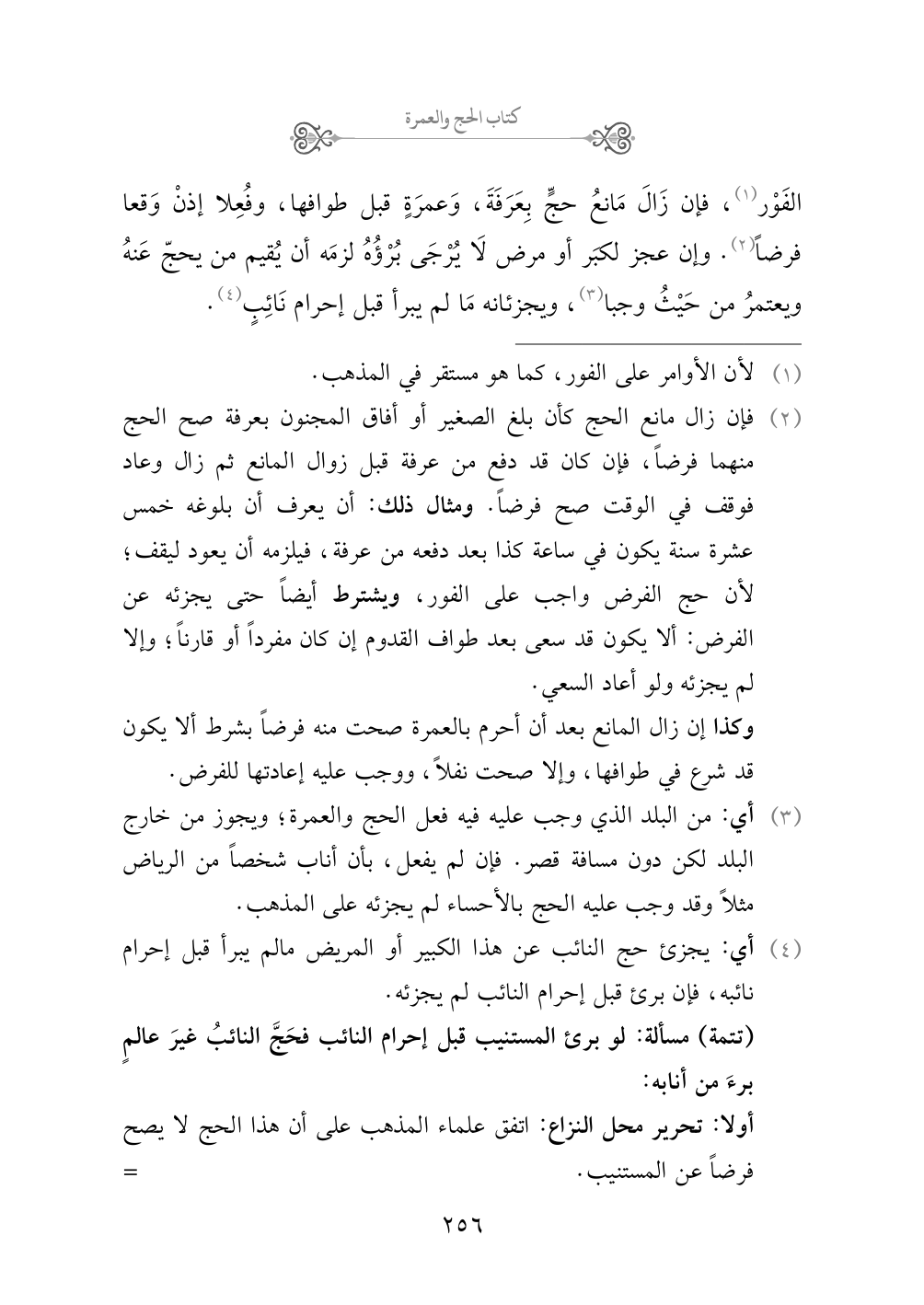 (¬٤) أي: يجزئ حج النائب عن هذا الكبير أو المريض مالم يبرأ قبل إحرام نائبه، فإن برئ قبل إحرام النائب لم يجزئه.