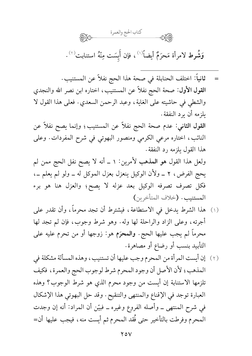 (¬٢) إن أيست المرأة من المحرم وجب عليها أن تستنيب، وهذه المسألة مشكلة في المذهب؛ لأن الأصل أن وجود المحرم شرط لوجوب الحج والعمرة، فكيف تلزمها الاستنابة إن أيست من وجود محرم الذي هو شرط الوجوب؟ وهذه العبارة توجد في الإقناع والمنتهى والتنقيح. وقد حل البهوتي هذا الإشكال في شرح المنتهى - وأصله الفروع وغيره - فبيّن أن المراد: أنه إن وجدت المحرم وفرطت بالتأخير حتى فُقد المحرم ثم أيست منه، فيجب عليها أن تستنيب. أما إن لم تجد محرماً يذهب معها إلى مكة، فلا يجب عليها أن تستنيب ولو كانت من أغنى الناس؛ لأن الحج لم يجب عليها. (إشكال وحله)