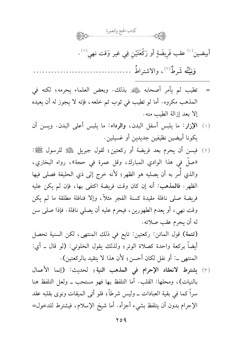 (¬٣) يشترط لانعقاد الإحرام في المذهب النية؛ لحديث: (إنما الأعمال بالنيات)، ومحلها: القلب. أما التلفظ بها فهو مستحب - ولعل التلفظ هنا سراً كما في بقية العبادات - وليس شرطاً؛ فلو أتى الميقات ونوى بقلبه عقد الإحرام بدون أن يتلفظ بشيء أجزأه. أما شيخ الإسلام، فيشترط للدخول في الإحرام مع النية وجود قول كالتلبية، أو فعل كأن يسوق الهدي.