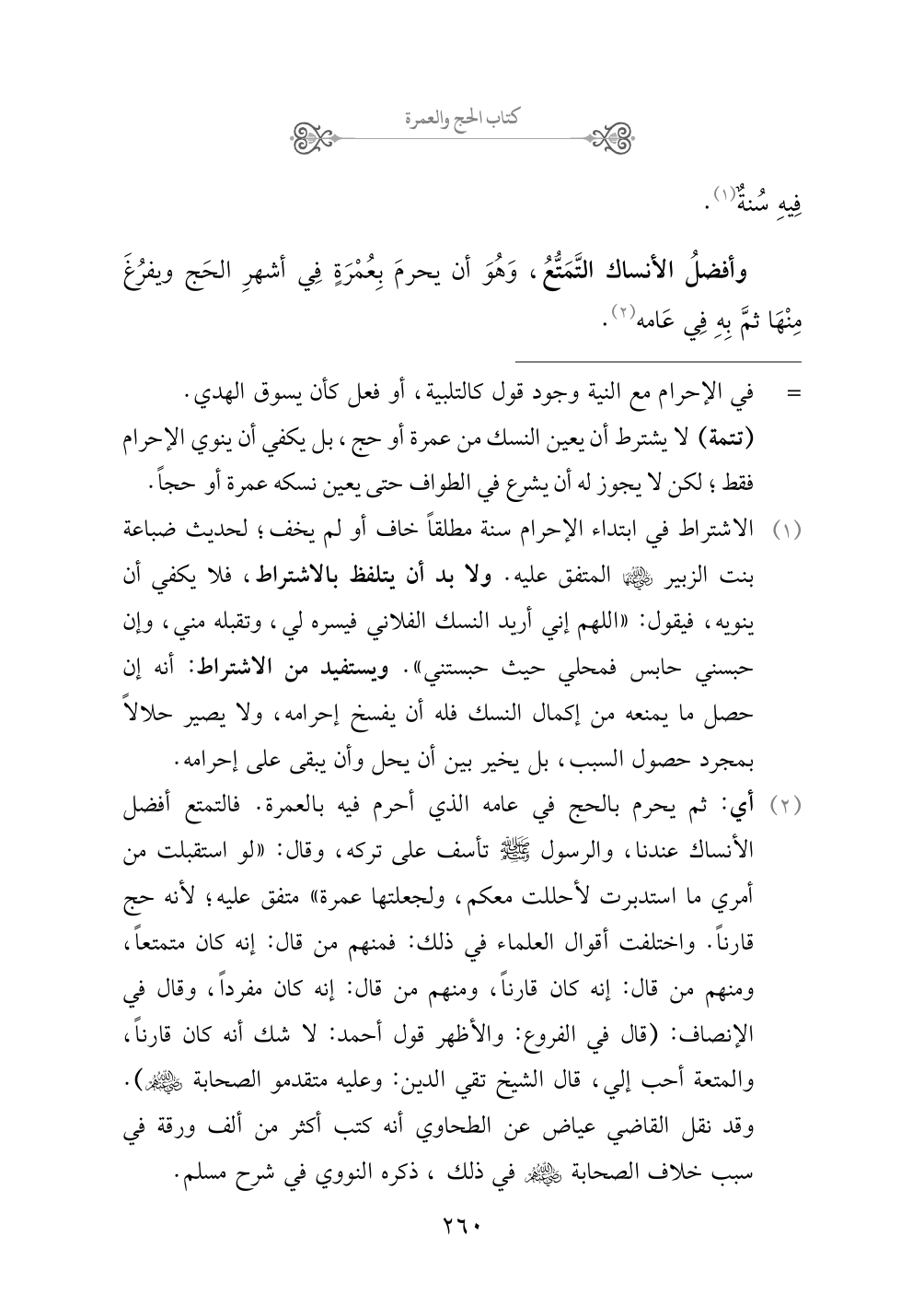 (¬١) الاشتراط في ابتداء الإحرام سنة مطلقاً خاف أو لم يخف؛ لحديث ضباعة بنت الزبير رضي الله عنها المتفق عليه. ولا بد أن يتلفظ بالاشتراط، فلا يكفي أن ينويه، فيقول: «اللهم إني أريد النسك الفلاني فيسره لي، وتقبله مني، وإن حبسني حابس فمحلي حيث حبستني». ويستفيد من الاشتراط: أنه إن حصل ما يمنعه من إكمال النسك فله أن يفسخ إحرامه، ولا يصير حلالاً بمجرد حصول السبب، بل يخير بين أن يحل وأن يبقى على إحرامه.