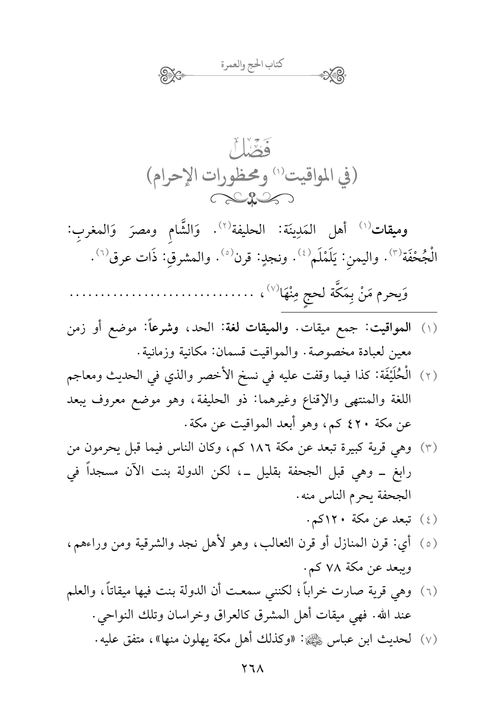 وميقات أهل المَدِينَة: الحليفة (¬٢). وَالشَّامِ ومصرَ وَالمغربِ: الْجُحْفَة (¬٣). واليمنِ: يَلَمْلَم (¬٤). ونجدٍ: قرن (¬٥). والمشرقِ: ذَات عرق (¬٦).