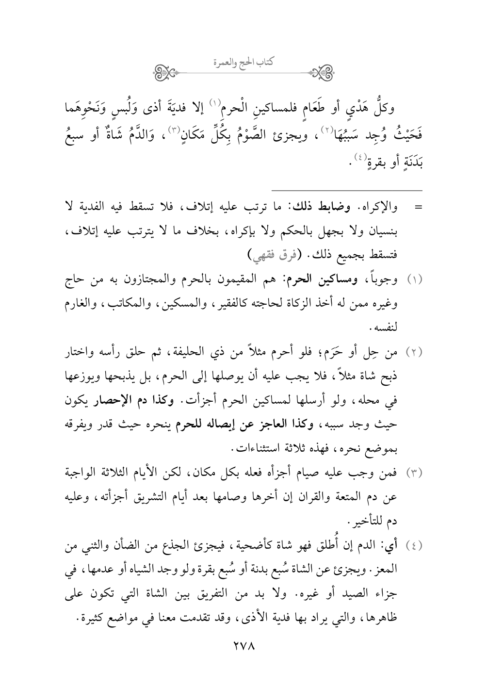 (¬٤) أي: الدم إن أُطلق فهو شاة كأضحية، فيجزئ الجذع من الضأن والثني من المعز. ويجزئ عن الشاة سُبع بدنة أو سُبع بقرة ولو وجد الشياه أو عدمها، في جزاء الصيد أو غيره. ولا بد من التفريق بين الشاة التي تكون على ظاهرها، والتي يراد بها فدية الأذى، وقد تقدمت معنا في مواضع كثيرة.