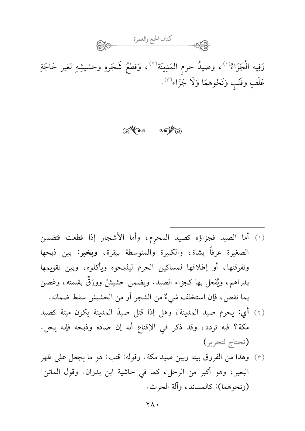 (¬١) أما الصيد فجزاؤه كصيد المحرِم، وأما الأشجار إذا قطعت فتضمن الصغيرة عرفاً بشاة، والكبيرة والمتوسطة ببقرة، ويخير: بين ذبحها وتفرقتها، أو إطلاقها لمساكين الحرم ليذبحوه ويأكلوه، وبين تقويمها بدراهم، ويُفعل بها كجزاء الصيد. ويضمن حشيشٌ وورَقٌ بقيمته، وغصن بما نقص، فإن استخلف شيءٌ من الشجر أو من الحشيش سقط ضمانه.