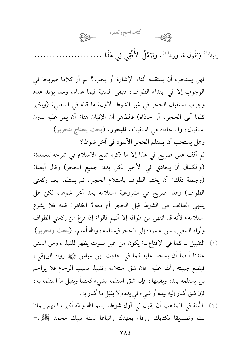 (¬١) التقبيل - كما في الإقناع -: يكون من غير صوت يظهر للقبلة، ومن السنن عندنا أيضاً أن يسجد عليه كما في حديث ابن عباس رضي الله عنهما رواه البيهقي، فيضع جبهته وأنفه عليه. فإن شق استلامه وتقبيله بسبب الزحام فلا يزاحم بل يستلمه بيده ويقبلها، فإن شق استلمه بشيء كعصاً ويقبل ما استلمه به، فإن شق أشار إليه بيده أو شيء في يده ولا يقبّل ما أشار به.