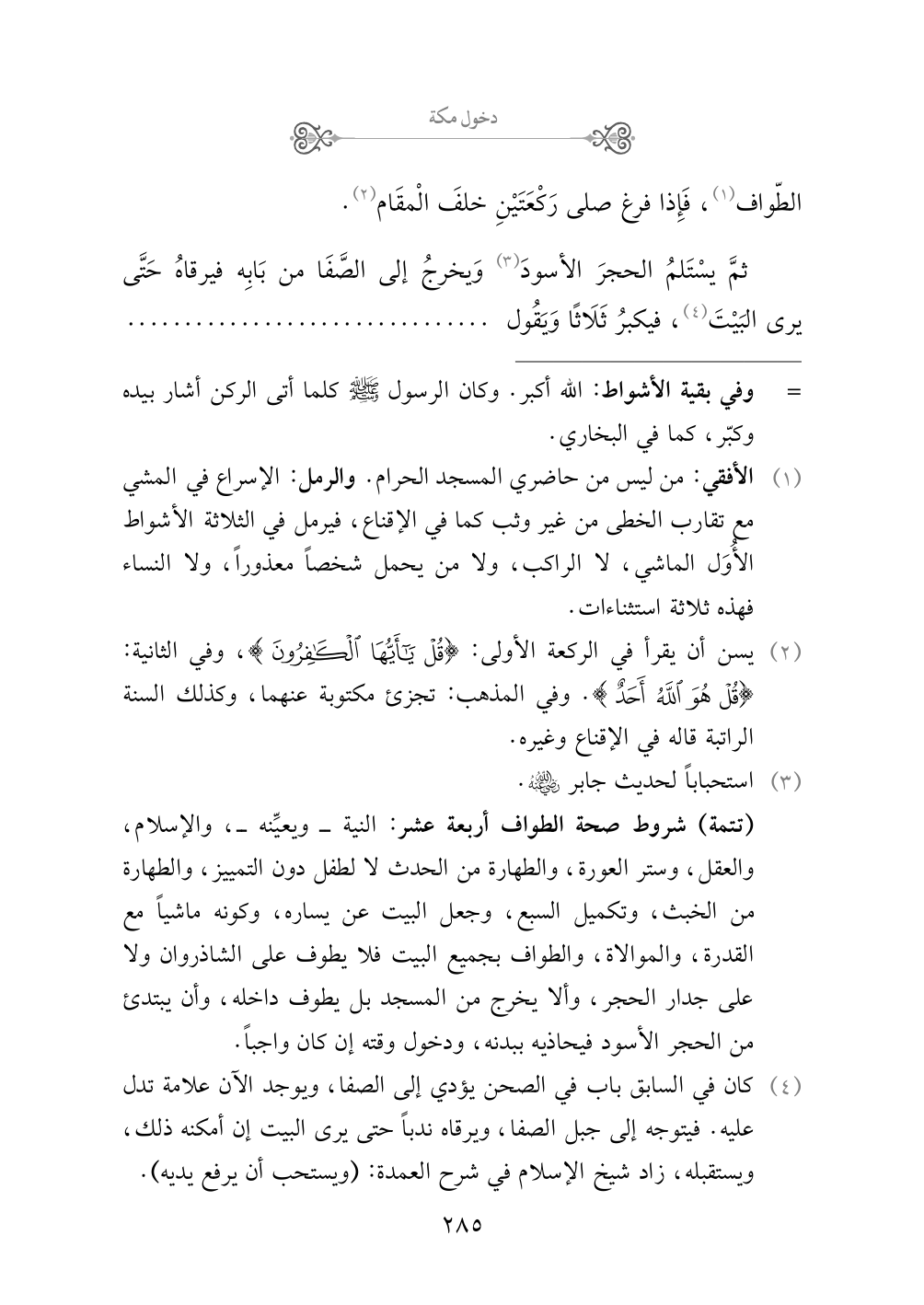 (تتمة) شروط صحة الطواف أربعة عشر: النية - ويعيِّنه -، والإسلام، والعقل، وستر العورة، والطهارة من الحدث لا لطفل دون التمييز، والطهارة من الخبث، وتكميل السبع، وجعل البيت عن يساره، وكونه ماشياً مع القدرة، والموالاة، والطواف بجميع البيت فلا يطوف على الشاذروان ولا على جدار الحجر، وألا يخرج من المسجد بل يطوف داخله، وأن يبتدئ من الحجر الأسود فيحاذيه ببدنه، ودخول وقته إن كان واجباً.