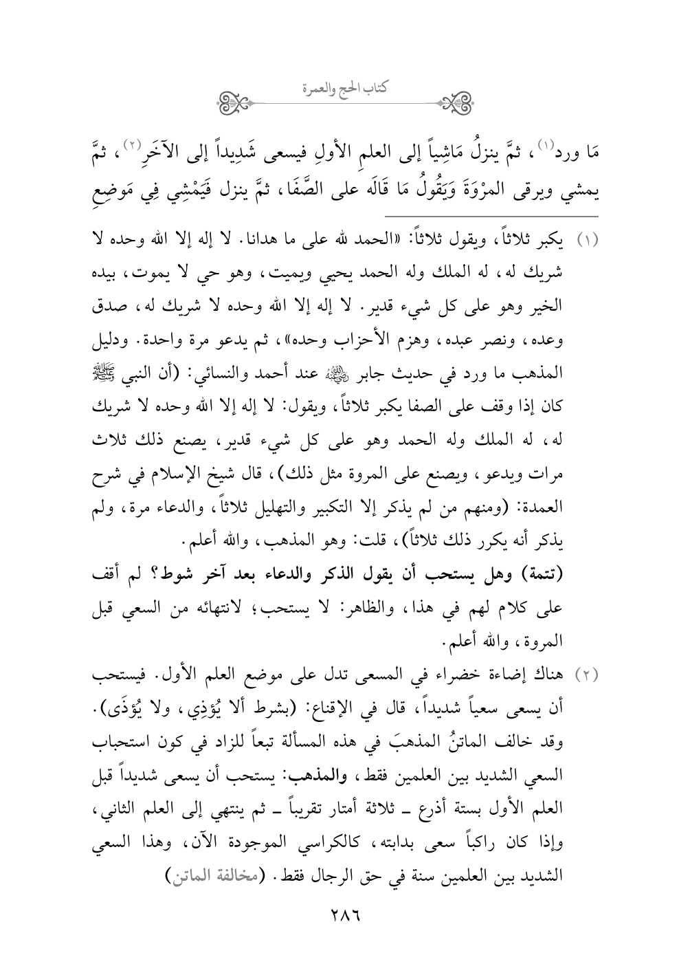 (¬٢) هناك إضاءة خضراء في المسعى تدل على موضع العلم الأول. فيستحب أن يسعى سعياً شديداً، قال في الإقناع: (بشرط ألا يُؤذِي، ولا يُؤذَى). وقد خالف الماتنُ المذهبَ في هذه المسألة تبعاً للزاد في كون استحباب السعي الشديد بين العلمين فقط، والمذهب: يستحب أن يسعى شديداً قبل العلم الأول بستة أذرع - ثلاثة أمتار تقريباً - ثم ينتهي إلى العلم الثاني، وإذا كان راكباً سعى بدابته، كالكراسي الموجودة الآن، وهذا السعي الشديد بين العلمين سنة في حق الرجال فقط. (مخالفة الماتن)