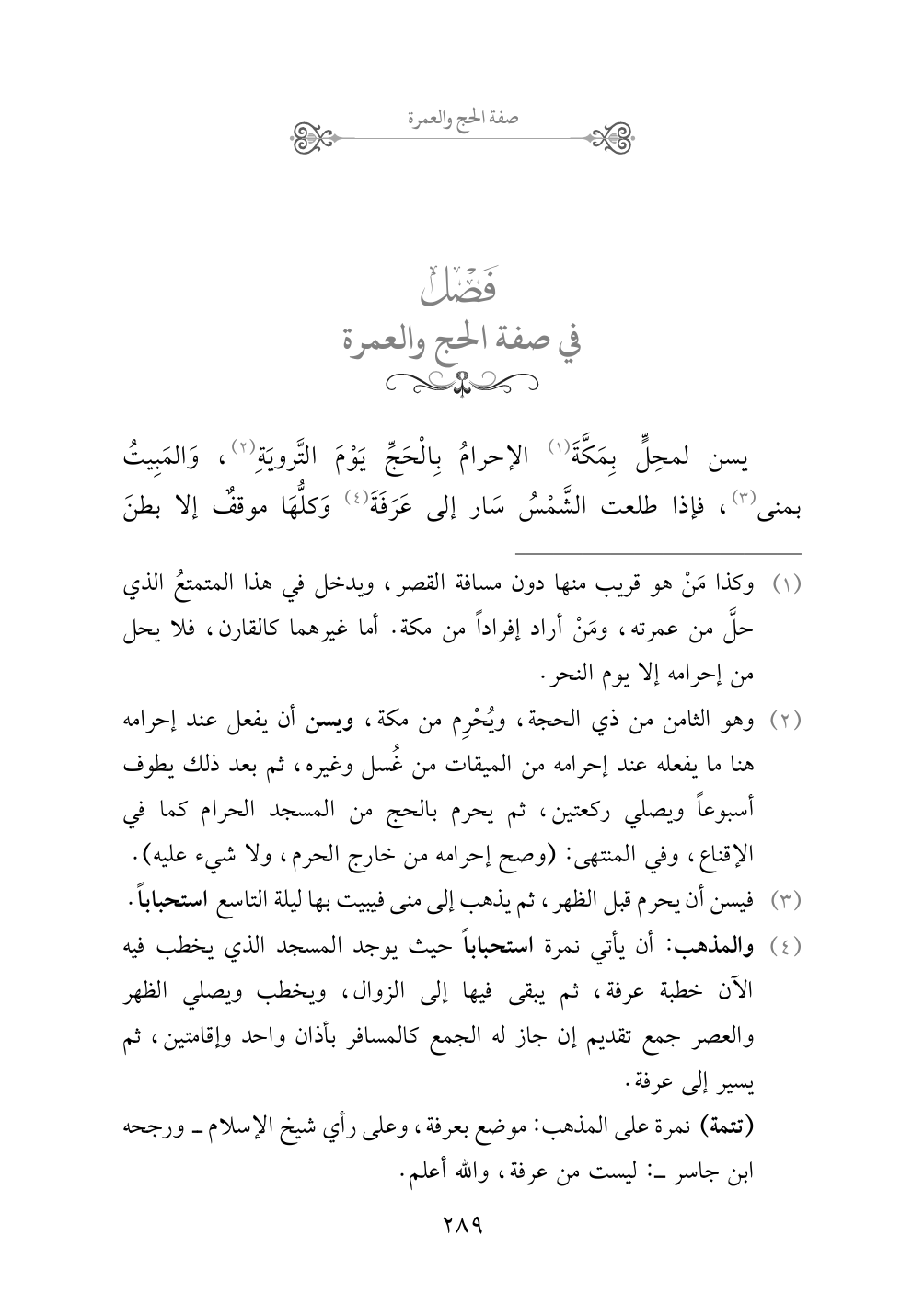 يسن لمحِلٍّ بِمَكَّةَ (¬١) الإحرامُ بِالْحَجِّ يَوْمَ التَّرويَةِ (¬٢)، وَالمَبِيتُ بمنى (¬٣)، فإذا طلعت الشَّمْسُ سَار إلى عَرَفَةَ (¬٤) وَكلُّهَا موقفٌ إلا بطنَ
