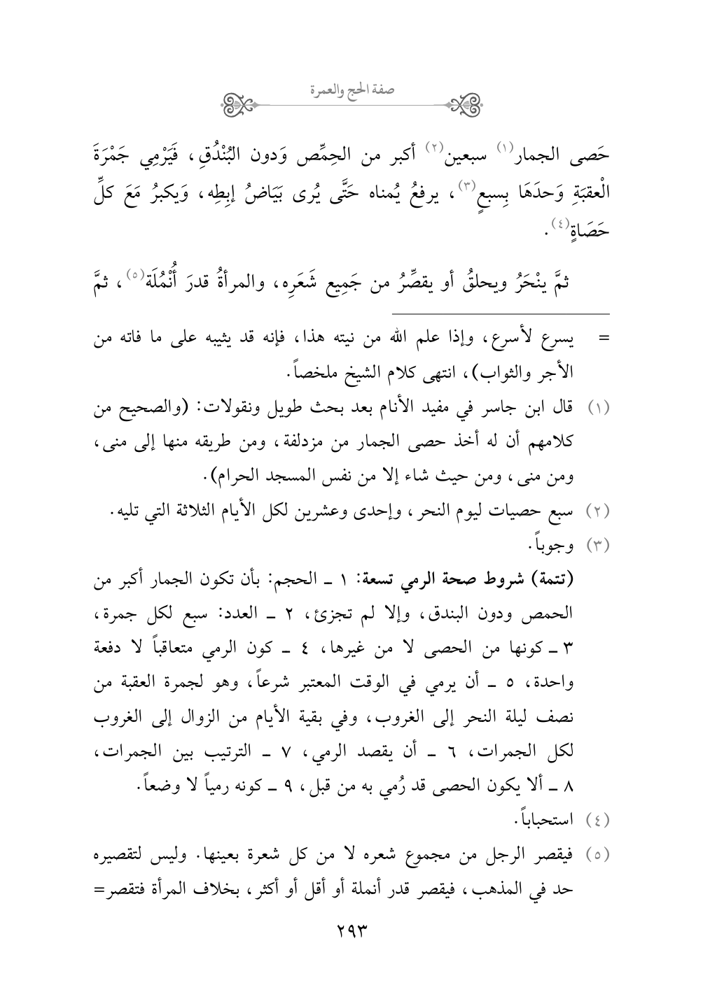 (تتمة) شروط صحة الرمي تسعة: ١ - الحجم: بأن تكون الجمار أكبر من الحمص ودون البندق، وإلا لم تجزئ، ٢ - العدد: سبع لكل جمرة، ٣ - كونها من الحصى لا من غيرها، ٤ - كون الرمي متعاقباً لا دفعة واحدة، ٥ - أن يرمي في الوقت المعتبر شرعاً، وهو لجمرة العقبة من نصف ليلة النحر إلى الغروب، وفي بقية الأيام من الزوال إلى الغروب لكل الجمرات، ٦ - أن يقصد الرمي، ٧ - الترتيب بين الجمرات، ٨ - ألا يكون الحصى قد رُمي به من قبل، ٩ - كونه رمياً لا وضعاً.
