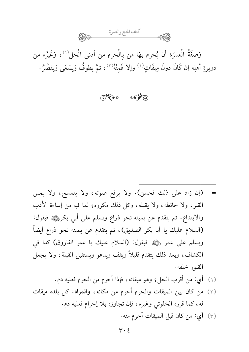 وَصفَةُ الْعمرَة أن يُحرم بهَا من بِالْحرم من أدنى الْحل (¬١)، وَغَيرُه من دويرةِ أهلِه إن كَانَ دونَ مِيقَاتٍ (¬٢) وإلا فَمِنْهُ (¬٣)، ثمَّ يطوفُ وَيسْعَى وَيقصِّرُ.