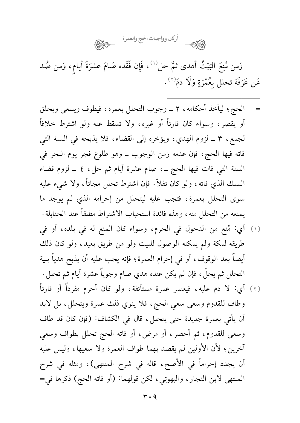 (¬١) أي: مُنع من الدخول في الحرم، وسواء كان المنع له في بلده، أو في طريقه لمكة ولم يمكنه الوصول للبيت ولو من طريق بعيد، ولو كان ذلك أيضاً بعد الوقوف، أو في إحرام العمرة؛ فإنه يجب عليه أن يذبح هدياً بنية التحلل ثم يحلّ، فإن لم يكن عنده هدي صام وجوباً عشرة أيام ثم تحلل.