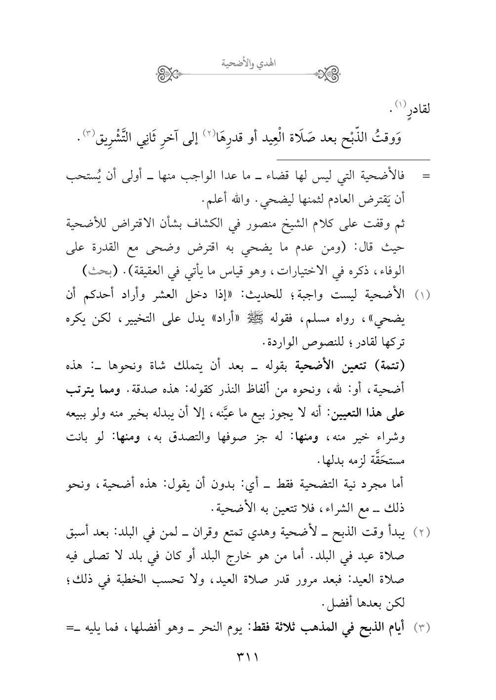 (¬٣) أيام الذبح في المذهب ثلاثة فقط: يوم النحر - وهو أفضلها، فما يليه - ويومان بعده، قال الإمام أحمد رحمه الله: (عن خمسة من أصحاب النبي صلى الله عليه وسلم)، أي: يقول بذلك خمسة منهم، أما الشيخ ابن عثيمين فيقول في الشرح الممتع: (يوم النحر، وثلاثة أيام بعده)، وهو القول الثاني في المذهب، واختاره شيخ الإسلام. فإن فاتت الصلاة بالزوال: ذبح بعده في اليوم الأول قاله المنتهى، ويجوز الذبح نهاراً، وكذا ليلاً؛ لكن قيَّده في الإقناع - وتابعه الغاية - بالكراهة ليلاً للخروج من الخلاف، وظاهر المنتهى - كالتنقيح - لا كراهة، قاله البهوتي في الكشاف. ولعل المذهب الكراهة، فليحرر؛ وذلك لكونها مصرحاً بها في الإقناع، فتُقدم على مفهوم المنتهى، ويؤيده كلام المرداوي في الإنصاف: (قلت: الأَولى الكراهة ليلاً مطلقاً)، والله أعلم. (مخالفة)