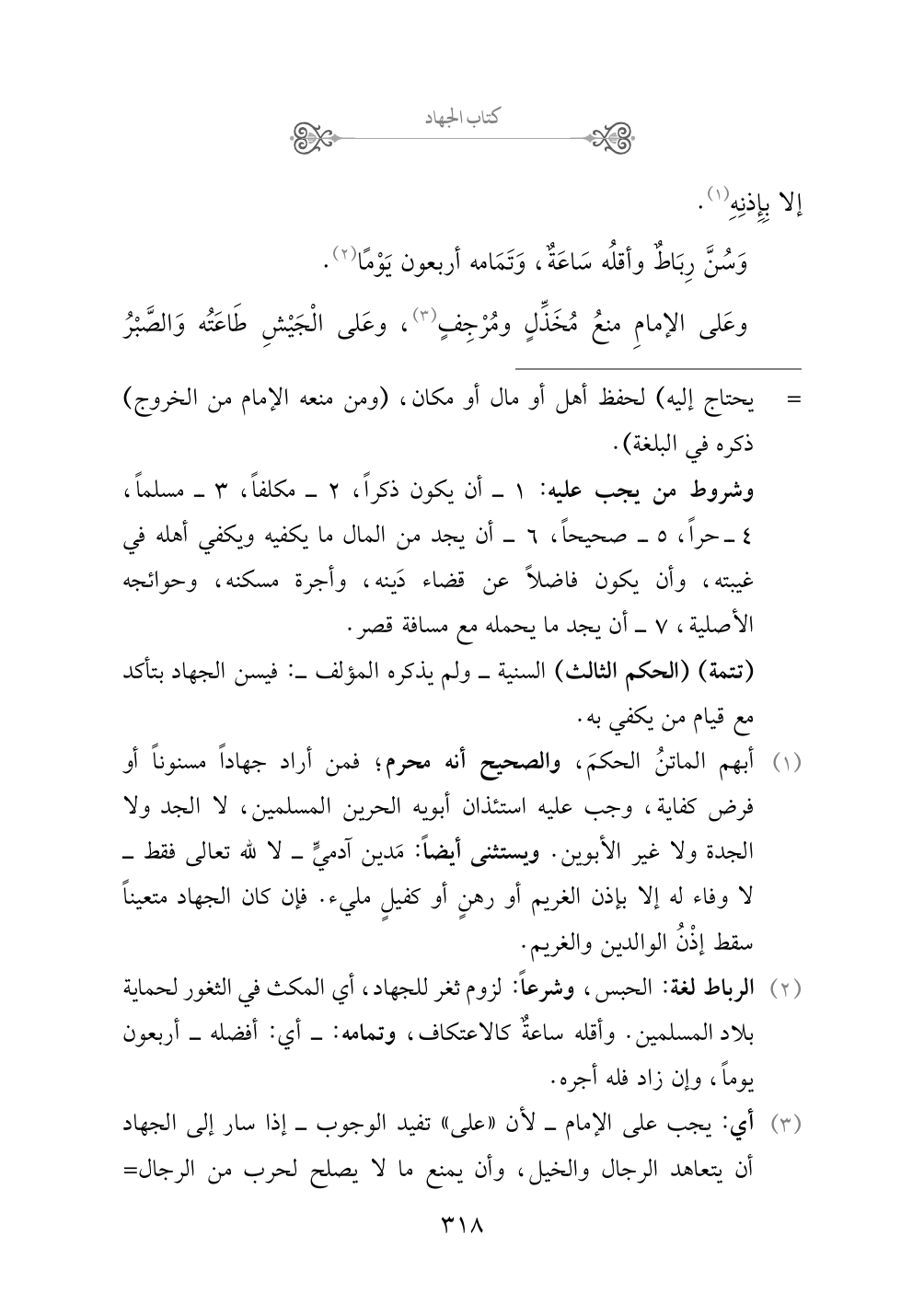 (¬٢) الرباط لغة: الحبس، وشرعاً: لزوم ثغر للجهاد، أي المكث في الثغور لحماية بلاد المسلمين. وأقله ساعةٌ كالاعتكاف، وتمامه: - أي: أفضله - أربعون يوماً، وإن زاد فله أجره.