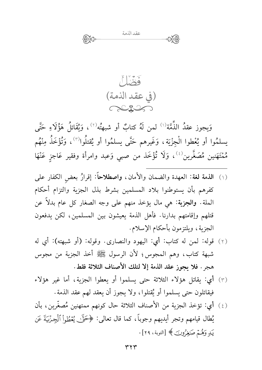 (¬٣) أي: يقاتل هؤلاء الثلاثة حتى يسلموا أو يعطوا الجزية، أما غير هؤلاء فيقاتلون حتى يسلموا أو يُقتلوا، ولا يجوز أن يعقد لهم عقد الذمة.