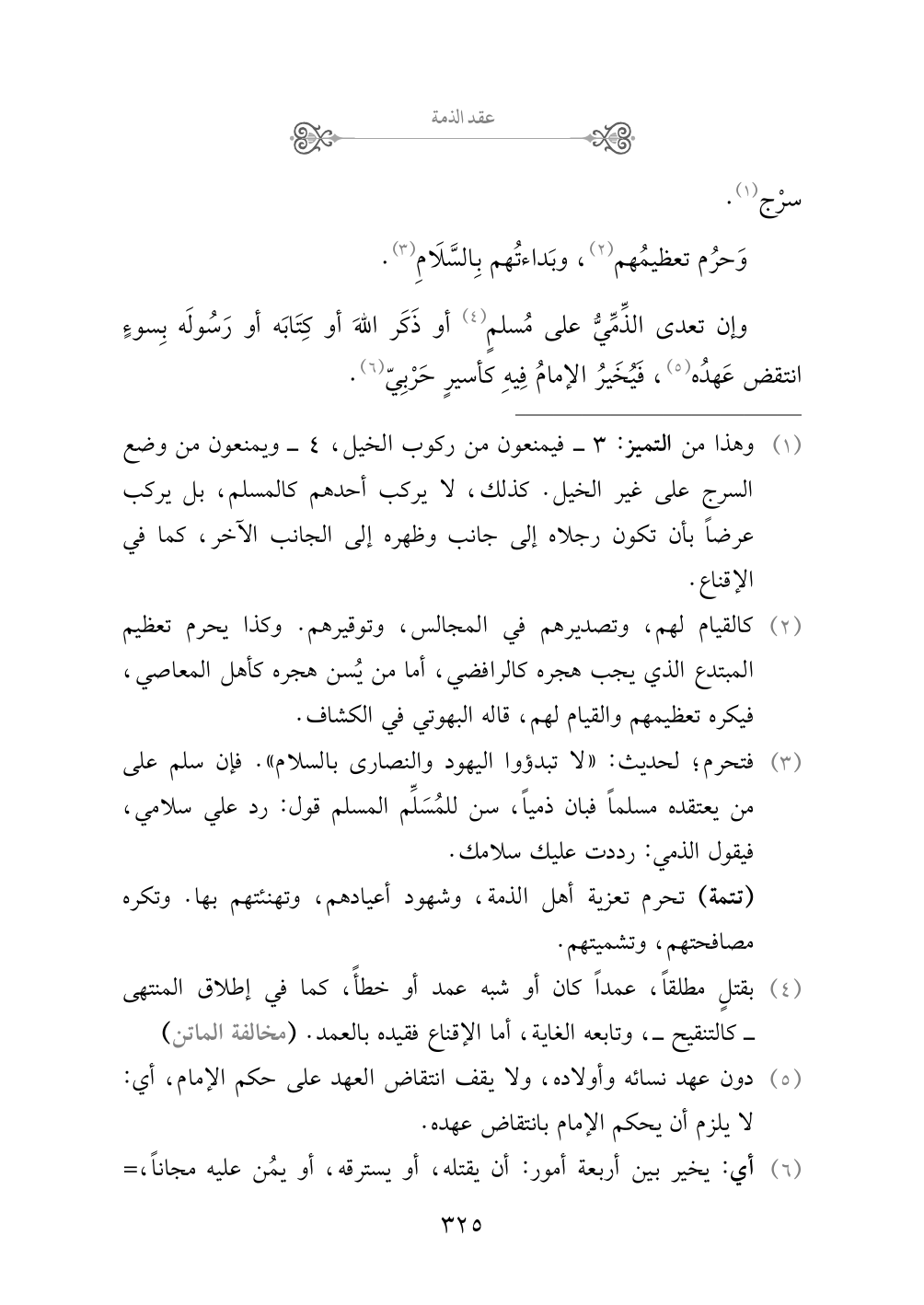 (¬١) وهذا من التميز: ٣ - فيمنعون من ركوب الخيل، ٤ - ويمنعون من وضع السرج على غير الخيل. كذلك، لا يركب أحدهم كالمسلم، بل يركب عرضاً بأن تكون رجلاه إلى جانب وظهره إلى الجانب الآخر، كما في الإقناع.
