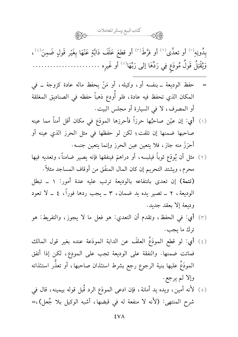 (¬٤) أي: لو قطع المودَعُ العلفَ عن الدابة المودَعة عنده بغير قول المالك فماتت ضمنها. والنفقة على الوديعة تجب على المودِع، لكن إذا أنفق المودَعُ عليها بنية الرجوع رجع بشرط استئذان صاحبها، أو تعذُّر استئذانه وإلا لم يرجع.
