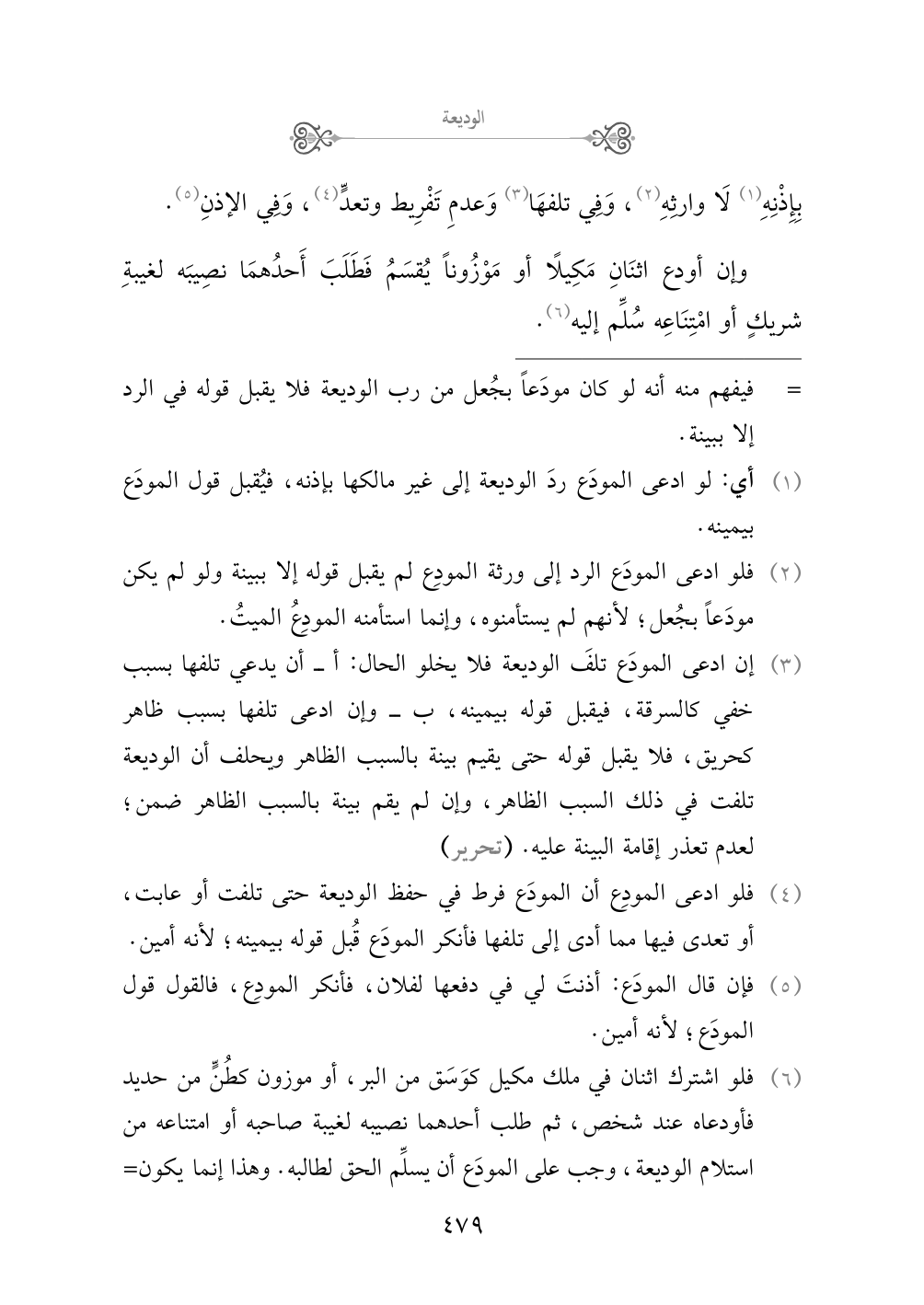 (¬٦) فلو اشترك اثنان في ملك مكيل كوَسَق من البر، أو موزون كطُنٍّ من حديد فأودعاه عند شخص، ثم طلب أحدهما نصيبه لغيبة صاحبه أو امتناعه من استلام الوديعة، وجب على المودَع أن يسلِّم الحق لطالبه. وهذا إنما يكون فيما يقبل القسمة بلا ضرر، وهو الذي لا ينقص بتفرقةٍ، قاله البهوتي، لا في مكيل أو موزون دخلته صناعة كآنية نحاس، أو غير مكيل وموزون كسيارة.