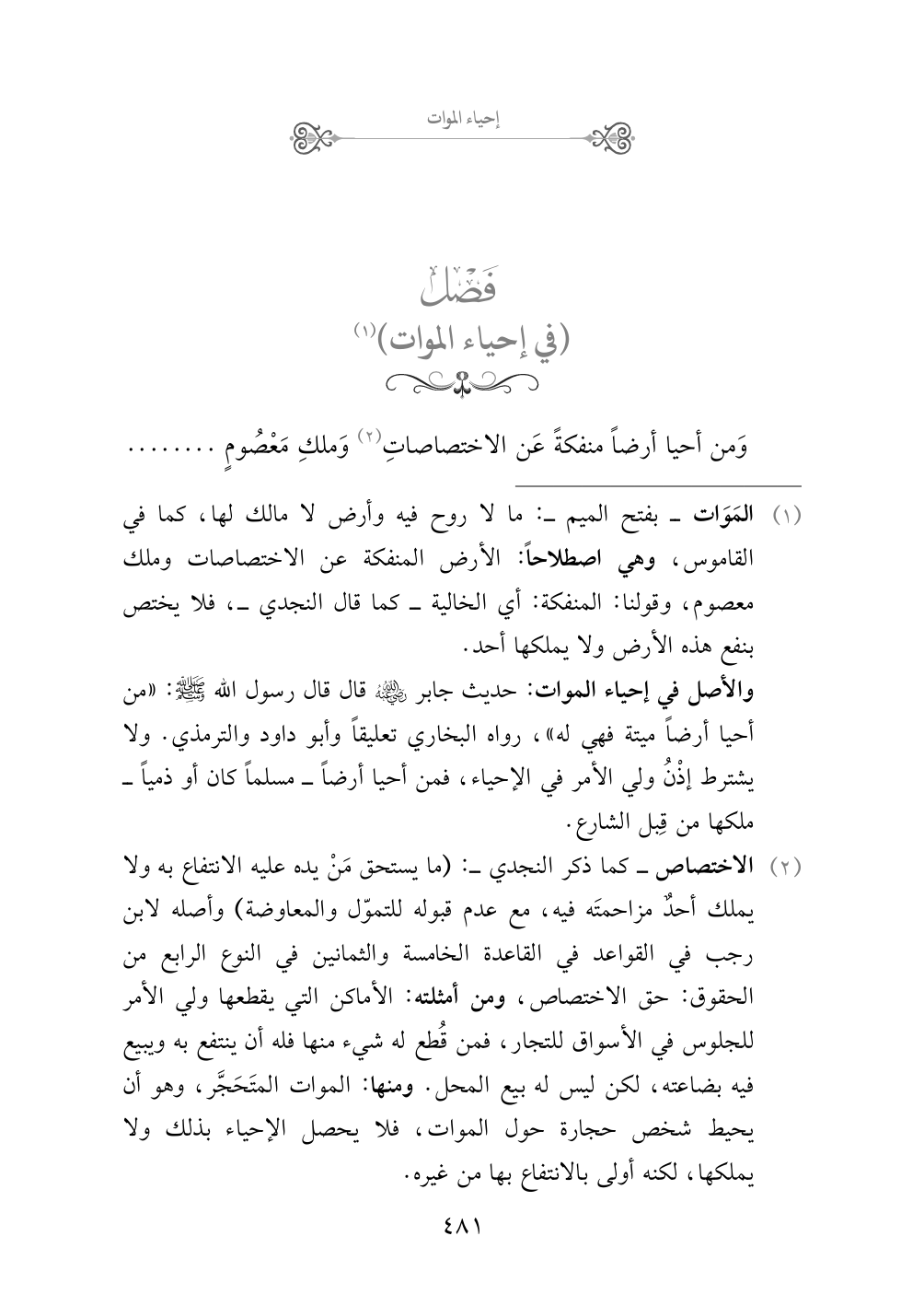 (¬١) المَوَات - بفتح الميم -: ما لا روح فيه وأرض لا مالك لها، كما في القاموس، وهي اصطلاحاً: الأرض المنفكة عن الاختصاصات وملك معصوم، وقولنا: المنفكة: أي الخالية - كما قال النجدي -، فلا يختص بنفع هذه الأرض ولا يملكها أحد.