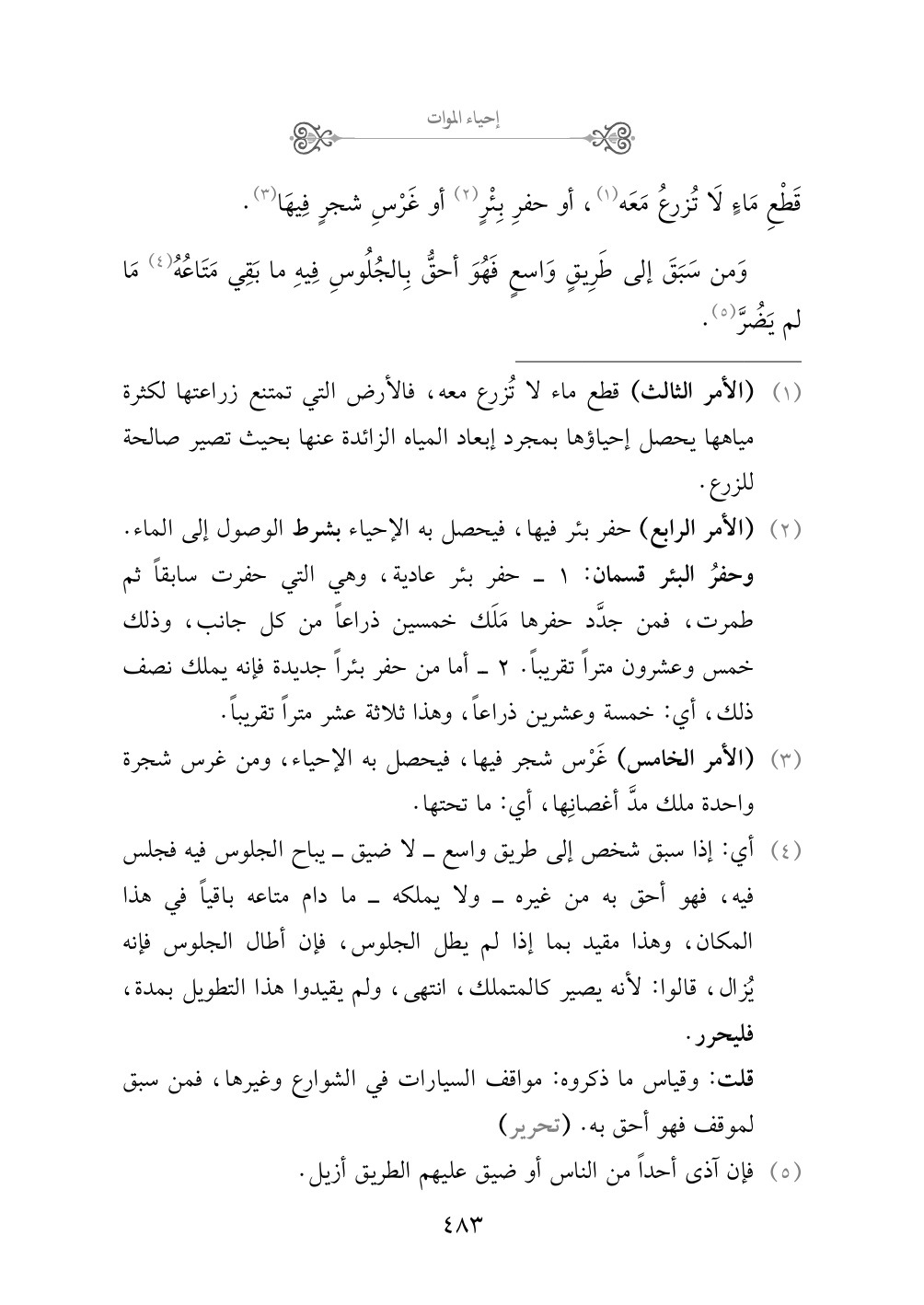 (¬٢) (الأمر الرابع) حفر بئر فيها، فيحصل به الإحياء بشرط الوصول إلى الماء. وحفرُ البئر قسمان: ١ - حفر بئر عادية، وهي التي حفرت سابقاً ثم طمرت، فمن جدَّد حفرها مَلَك خمسين ذراعاً من كل جانب، وذلك خمس وعشرون متراً تقريباً. ٢ - أما من حفر بئراً جديدة فإنه يملك نصف ذلك، أي: خمسة وعشرين ذراعاً، وهذا ثلاثة عشر متراً تقريباً.