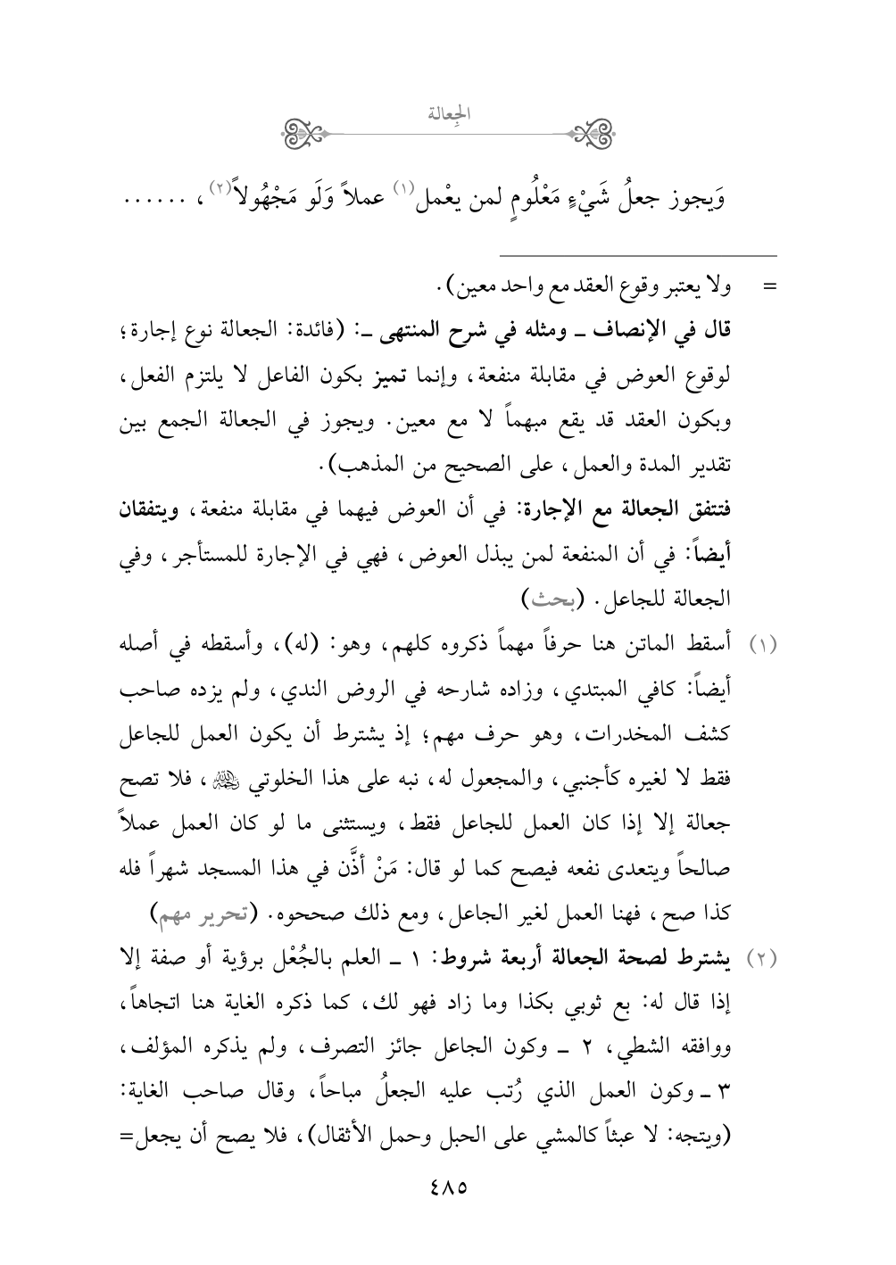 (¬٢) يشترط لصحة الجعالة أربعة شروط: ١ - العلم بالجُعْل برؤية أو صفة إلا إذا قال له: بع ثوبي بكذا وما زاد فهو لك، كما ذكره الغاية هنا اتجاهاً، ووافقه الشطي، ٢ - وكون الجاعل جائز التصرف، ولم يذكره المؤلف، ٣ - وكون العمل الذي رُتب عليه الجعلُ مباحاً، وقال صاحب الغاية: (ويتجه: لا عبثاً كالمشي على الحبل وحمل الأثقال)، فلا يصح أن يجعل مبلغاً لمن يمشي على حبل أو يحمل أثقالاً؛ لأنه يعرض به غيرَه للخطر ولا يستفاد منه، ٤ - أن يكون العمل المجاعل عليه للجاعل لا لغيره إلا إذا كان عملاً صالحاً ويتعدى نفعه، وتقدم تقرير هذا قريباً.