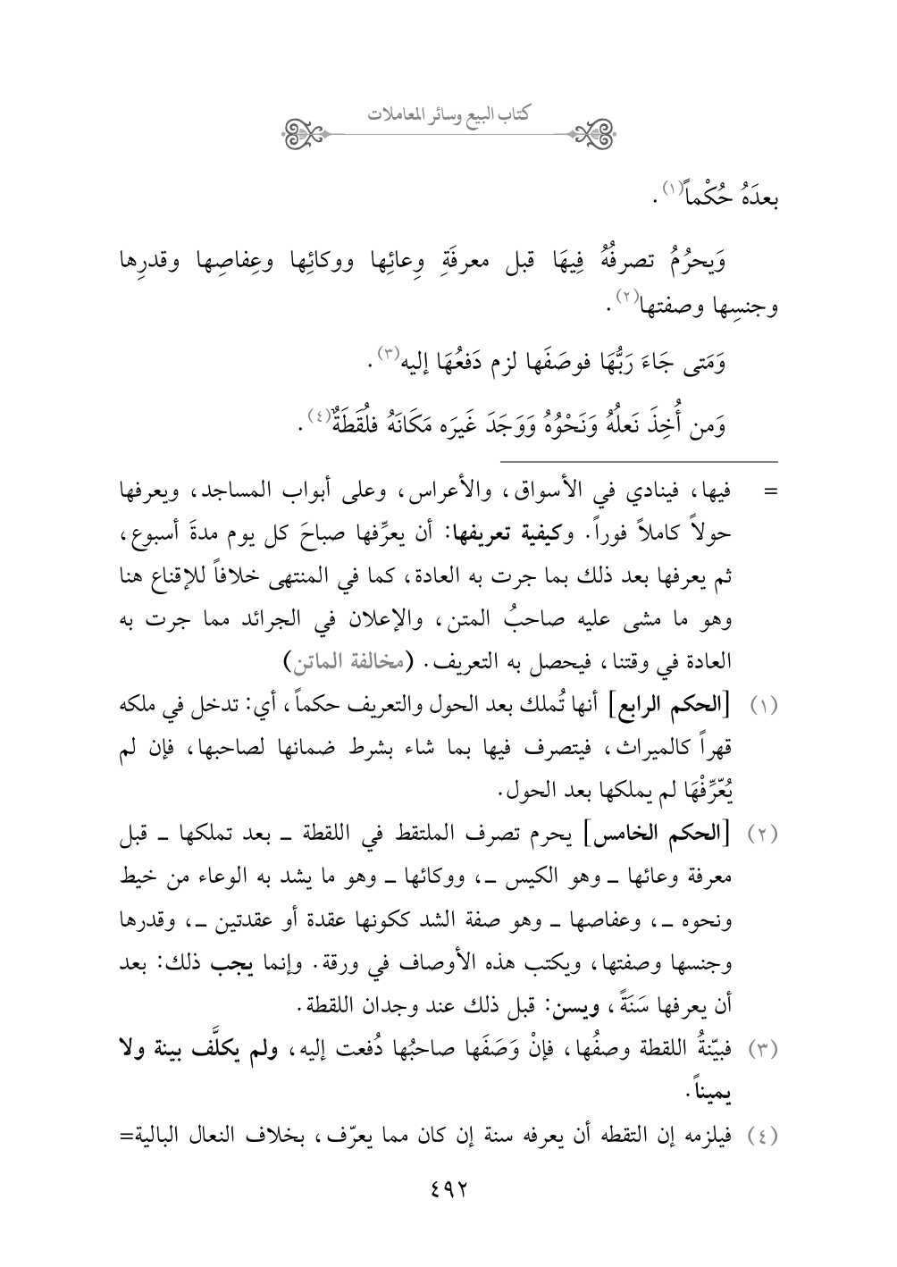(¬١) [الحكم الرابع] أنها تُملك بعد الحول والتعريف حكماً، أي: تدخل في ملكه قهراً كالميراث، فيتصرف فيها بما شاء بشرط ضمانها لصاحبها، فإن لم يُعّرِّفْهَا لم يملكها بعد الحول.