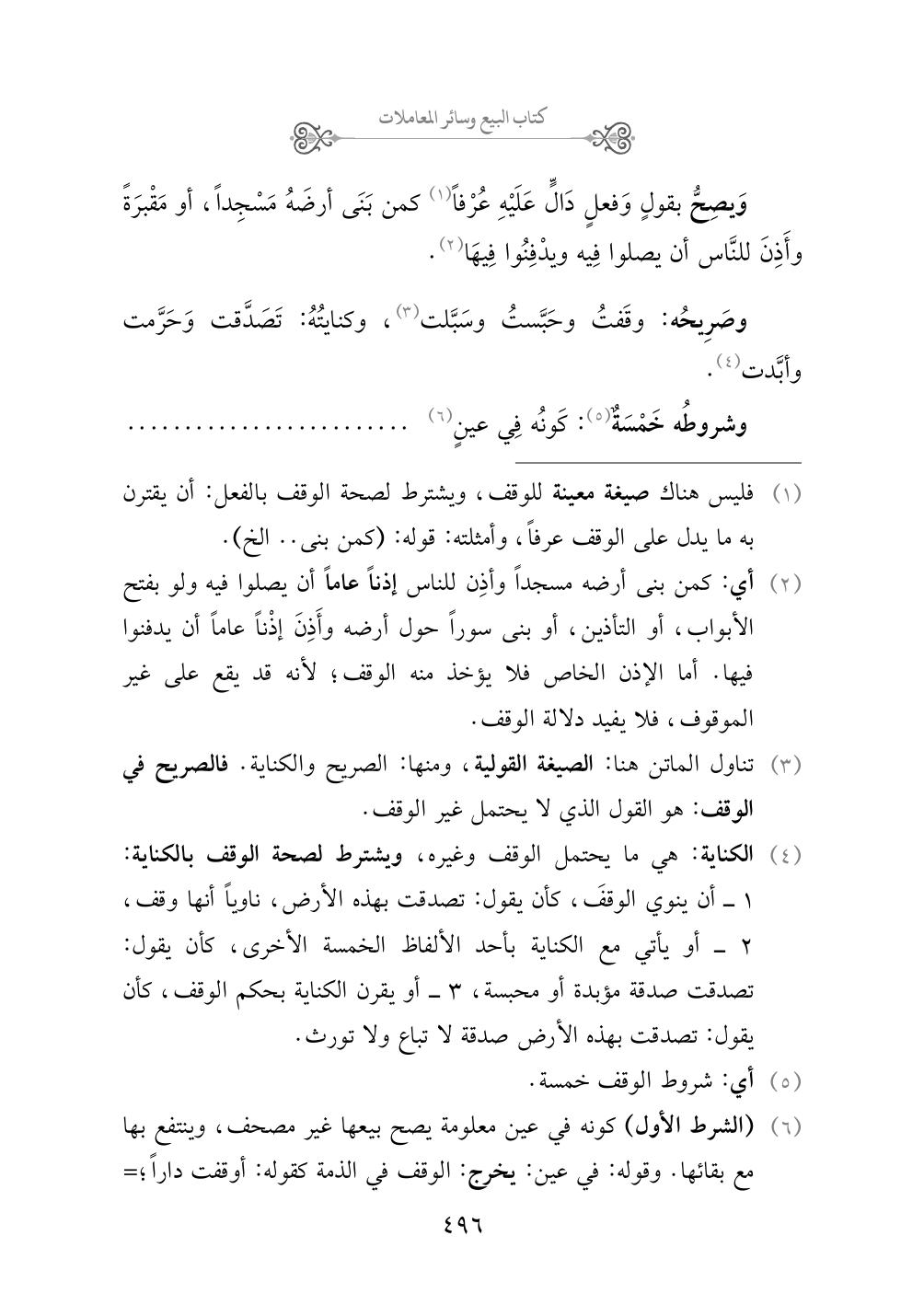 (¬٤) الكناية: هي ما يحتمل الوقف وغيره، ويشترط لصحة الوقف بالكناية: ١ - أن ينوي الوقفَ، كأن يقول: تصدقت بهذه الأرض، ناوياً أنها وقف، ٢ - أو يأتي مع الكناية بأحد الألفاظ الخمسة الأخرى، كأن يقول: تصدقت صدقة مؤبدة أو محبسة، ٣ - أو يقرن الكناية بحكم الوقف، كأن يقول: تصدقت بهذه الأرض صدقة لا تباع ولا تورث.