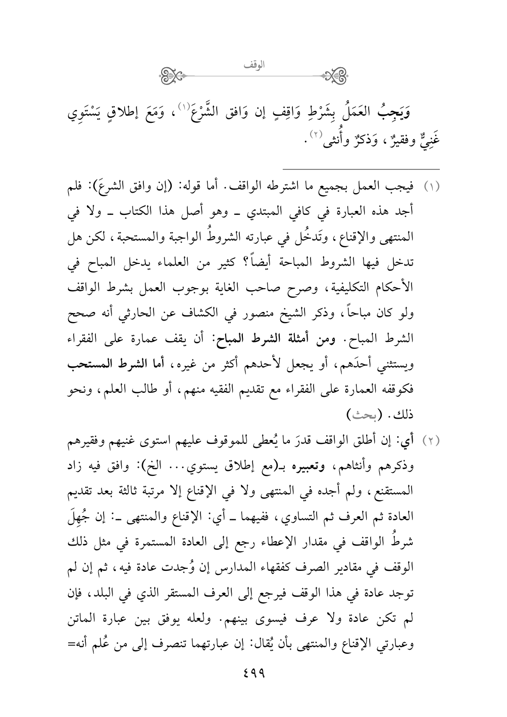 (¬١) فيجب العمل بجميع ما اشترطه الواقف. أما قوله: (إن وافق الشرعَ): فلم أجد هذه العبارة في كافي المبتدي - وهو أصل هذا الكتاب - ولا في المنتهى والإقناع، وتَدخُل في عبارته الشروطُ الواجبة والمستحبة، لكن هل تدخل فيها الشروط المباحة أيضاً؟ كثير من العلماء يدخل المباح في الأحكام التكليفية، وصرح صاحب الغاية بوجوب العمل بشرط الواقف ولو كان مباحاً، وذكر الشيخ منصور في الكشاف عن الحارثي أنه صحح الشرط المباح. ومن أمثلة الشرط المباح: أن يقف عمارة على الفقراء ويستثني أحدَهم، أو يجعل لأحدهم أكثر من غيره، أما الشرط المستحب فكوقفه العمارة على الفقراء مع تقديم الفقيه منهم، أو طالب العلم، ونحو ذلك. (بحث)