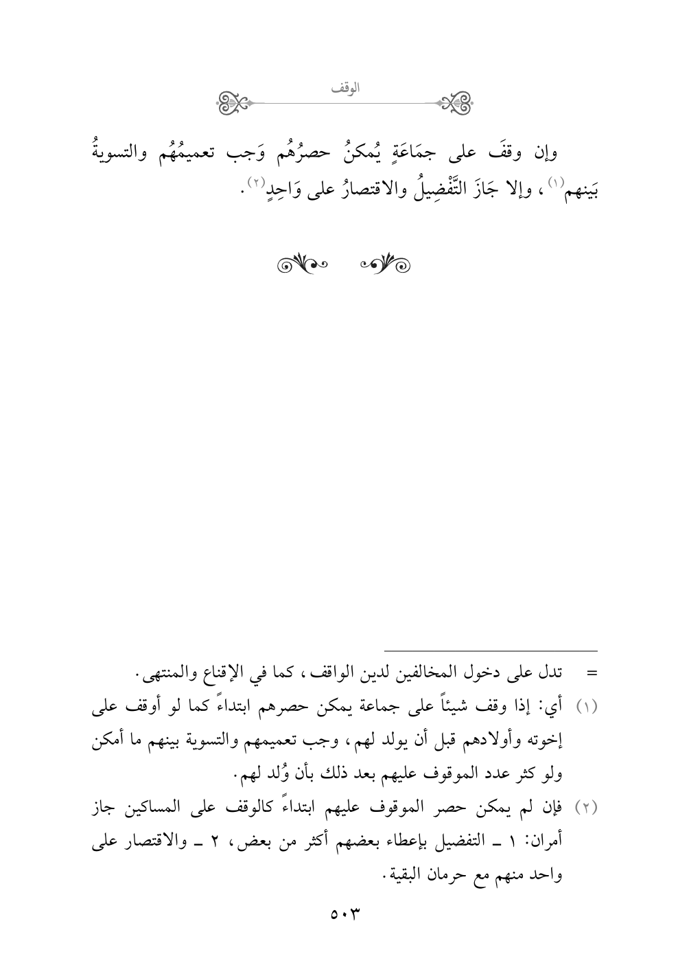 (¬٢) فإن لم يمكن حصر الموقوف عليهم ابتداءً كالوقف على المساكين جاز أمران: ١ - التفضيل بإعطاء بعضهم أكثر من بعض، ٢ - والاقتصار على واحد منهم مع حرمان البقية.
