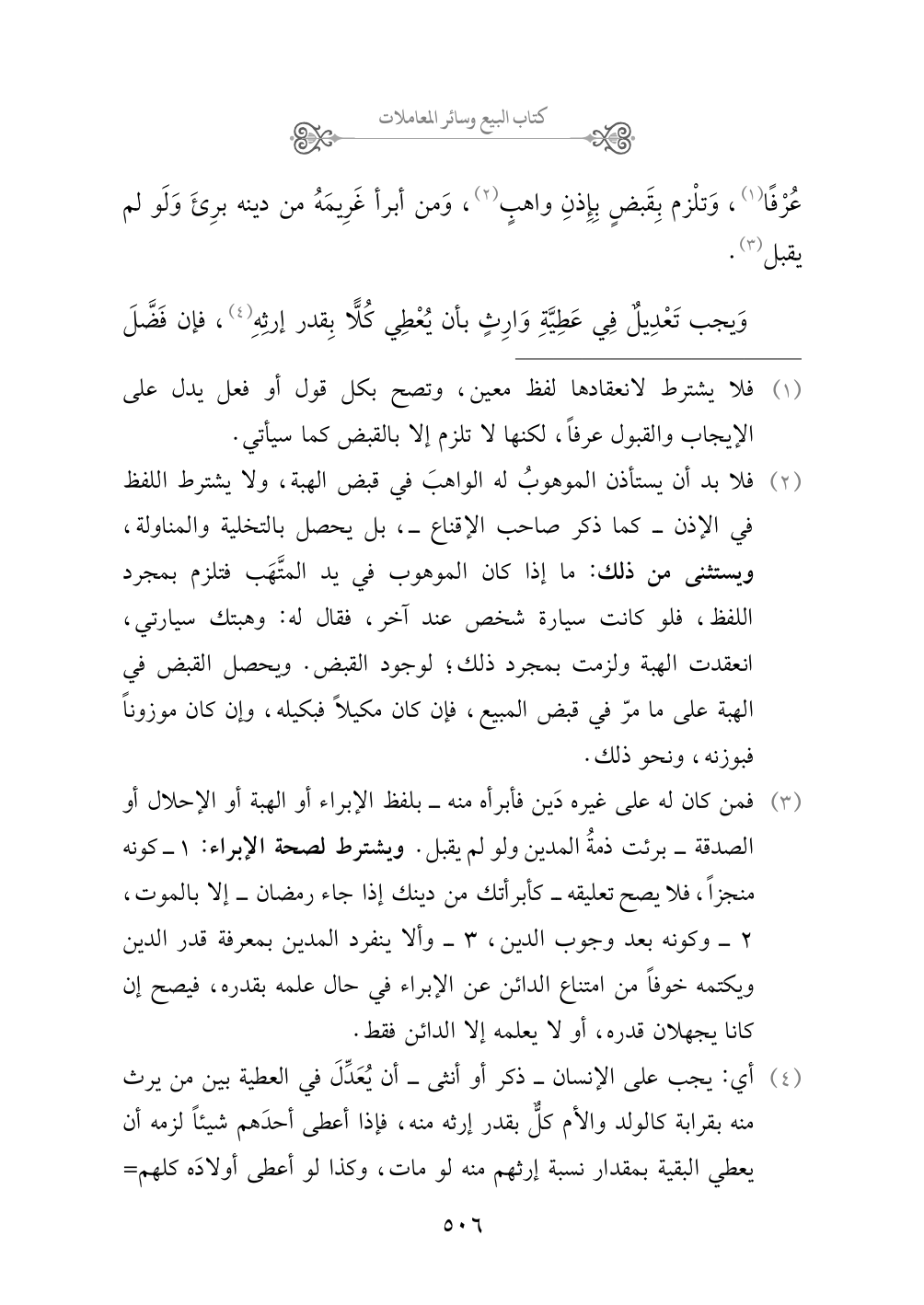عُرْفًا (¬١)، وَتلْزم بِقَبضٍ بِإِذنِ واهبٍ (¬٢)، وَمن أبرأ غَرِيمَهُ من دينه برِئَ وَلَو لم يقبل (¬٣).