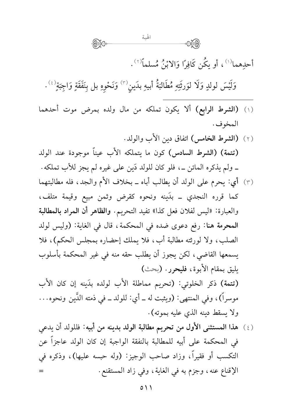 (¬٤) هذا المستثنى الأول من تحريم مطالبة الولد بدينه من أبيه: فللولد أن يدعي في المحكمة على أبيه للمطالبة بالنفقة الواجبة إن كان الولد عاجزاً عن التكسب أو فقيراً، وزاد صاحب الوجيز: (وله حبسه عليها)، وذكره في الإقناع عنه، وجزم به في الغاية، وفي زاد المستقنع.