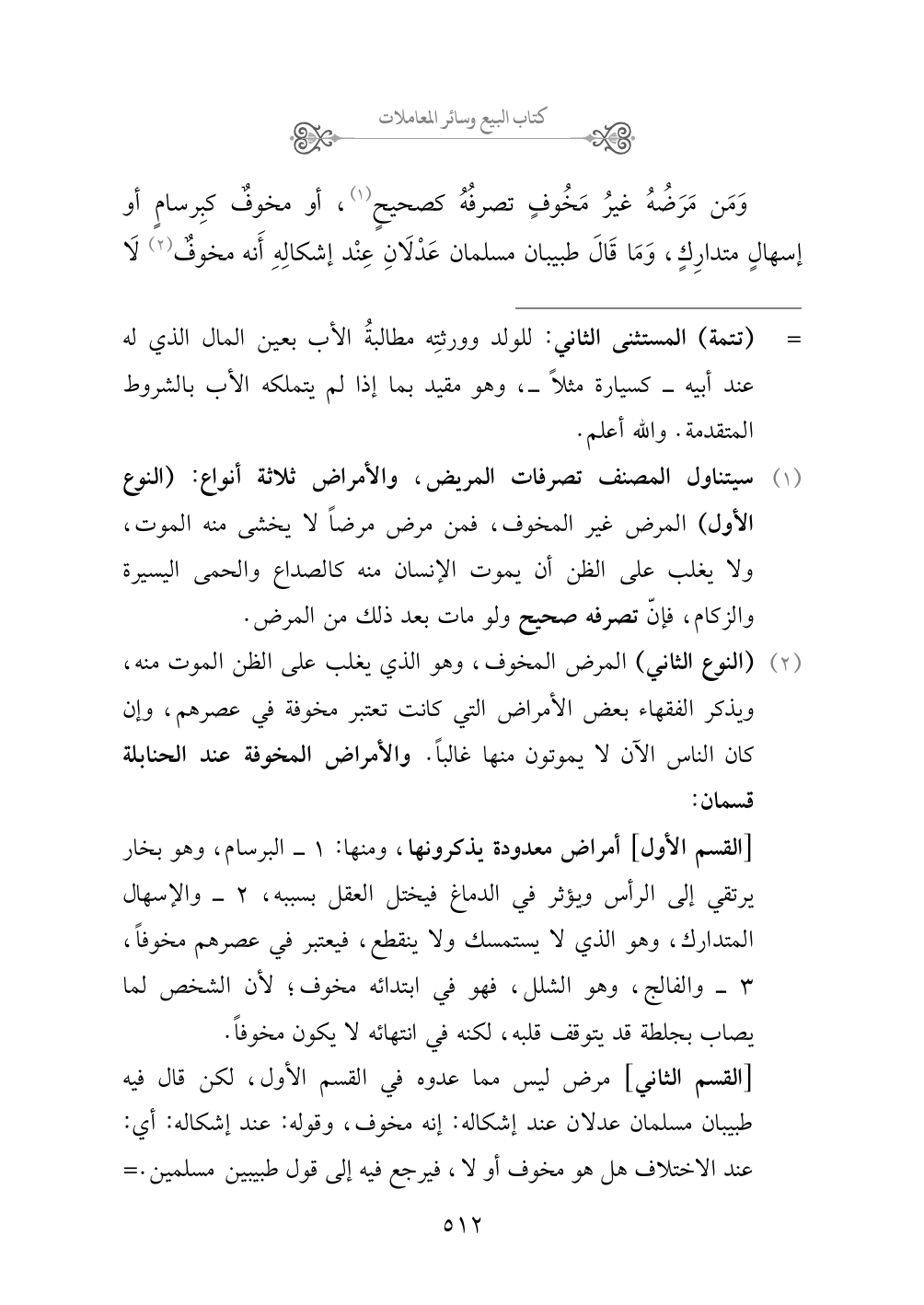 (¬٢) (النوع الثاني) المرض المخوف، وهو الذي يغلب على الظن الموت منه، ويذكر الفقهاء بعض الأمراض التي كانت تعتبر مخوفة في عصرهم، وإن كان الناس الآن لا يموتون منها غالباً. والأمراض المخوفة عند الحنابلة قسمان: