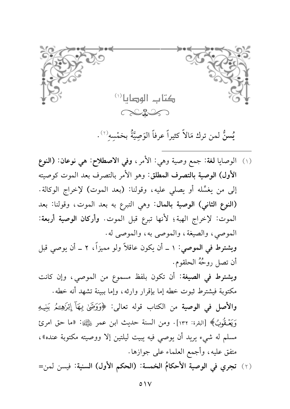 (¬١) الوصايا لغة: جمع وصية وهي: الأمر، وفي الاصطلاح: هي نوعان: (النوع الأول) الوصية بالتصرف المطلق: وهو الأمر بالتصرف بعد الموت كوصيته إلى من يغسِّله أو يصلي عليه، وقولنا: (بعد الموت) لإخراج الوكالة. (النوع الثاني) الوصية بالمال: وهي التبرع به بعد الموت، وقولنا: بعد الموت: لإخراج الهبة؛ لأنها تبرع قبل الموت. وأركان الوصية أربعة: الموصي، والصيغة، والموصى به، والموصى له.