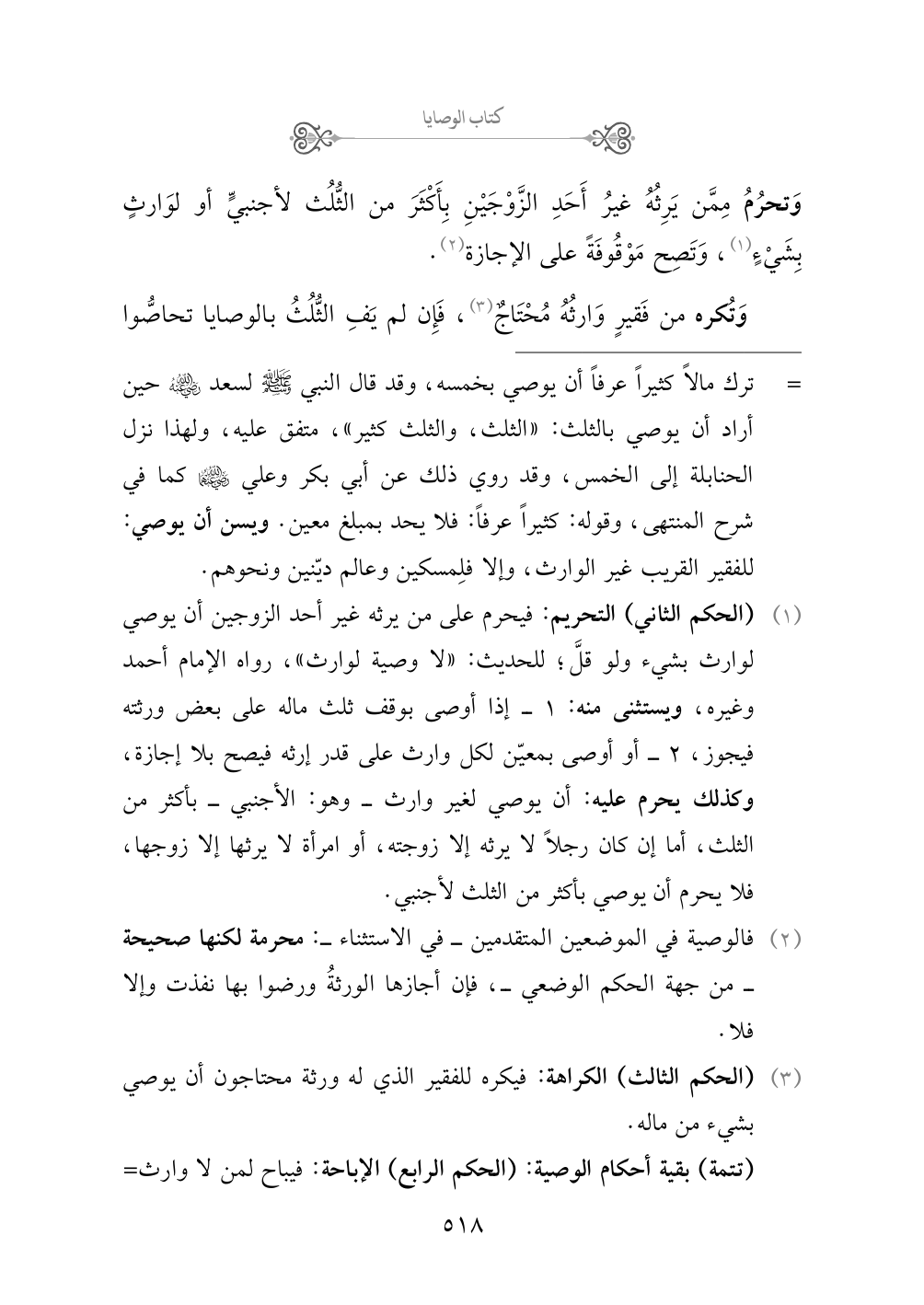 (¬١) (الحكم الثاني) التحريم: فيحرم على من يرثه غير أحد الزوجين أن يوصي لوارث بشيء ولو قلَّ؛ للحديث: «لا وصية لوارث»، رواه الإمام أحمد وغيره، ويستثنى منه: (١) - إذا أوصى بوقف ثلث ماله على بعض ورثته فيجوز، ٢ - أو أوصى بمعيّن لكل وارث على قدر إرثه فيصح بلا إجازة، وكذلك يحرم عليه: أن يوصي لغير وارث - وهو: الأجنبي - بأكثر من الثلث، أما إن كان رجلاً لا يرثه إلا زوجته، أو امرأة لا يرثها إلا زوجها، فلا يحرم أن يوصي بأكثر من الثلث لأجنبي.