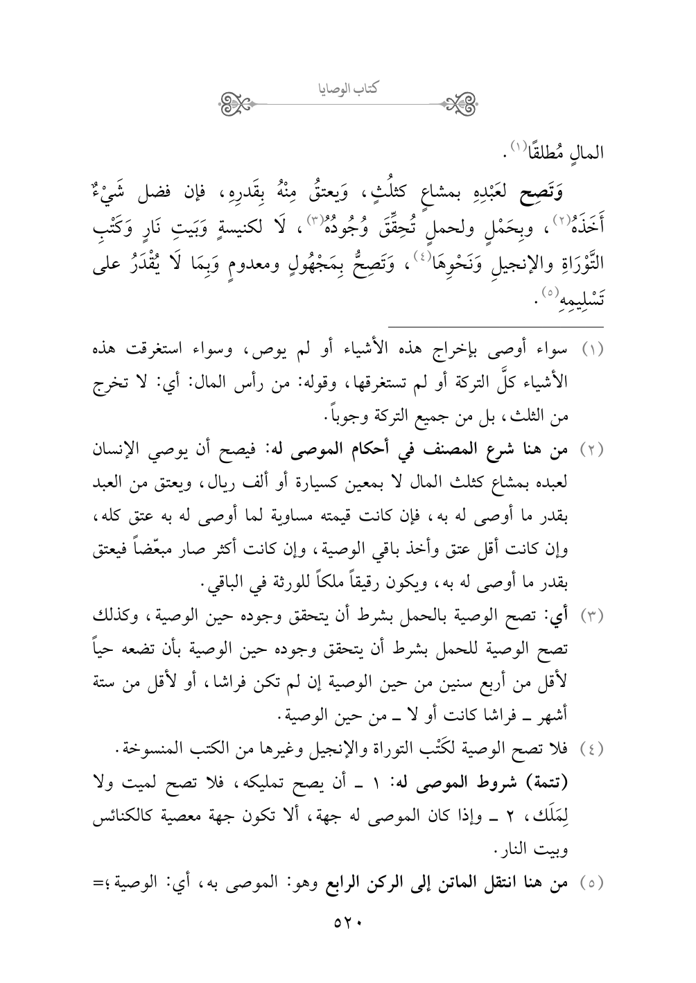 (¬٥) من هنا انتقل الماتن إلى الركن الرابع وهو: الموصى به، أي: الوصية؛ فتصح الوصية بمجهول: كأن يقول: «أوصيت لزيد بقميص» ويسكت، فيُعطى ما يقع عليه الاسم، فأي قميص أُعطي صح سواء كان جديداً أو قديماً. وكذلك تصح الوصية بمعدوم: كأن يوصي بما تحمل شجرتُه أو شاتُه. وتصح أيضاً بما لا يقدر على تسليمه: كأن يوصي بعبده الآبق، أو جمله الشارد، أو طيره الذي في الهواء.