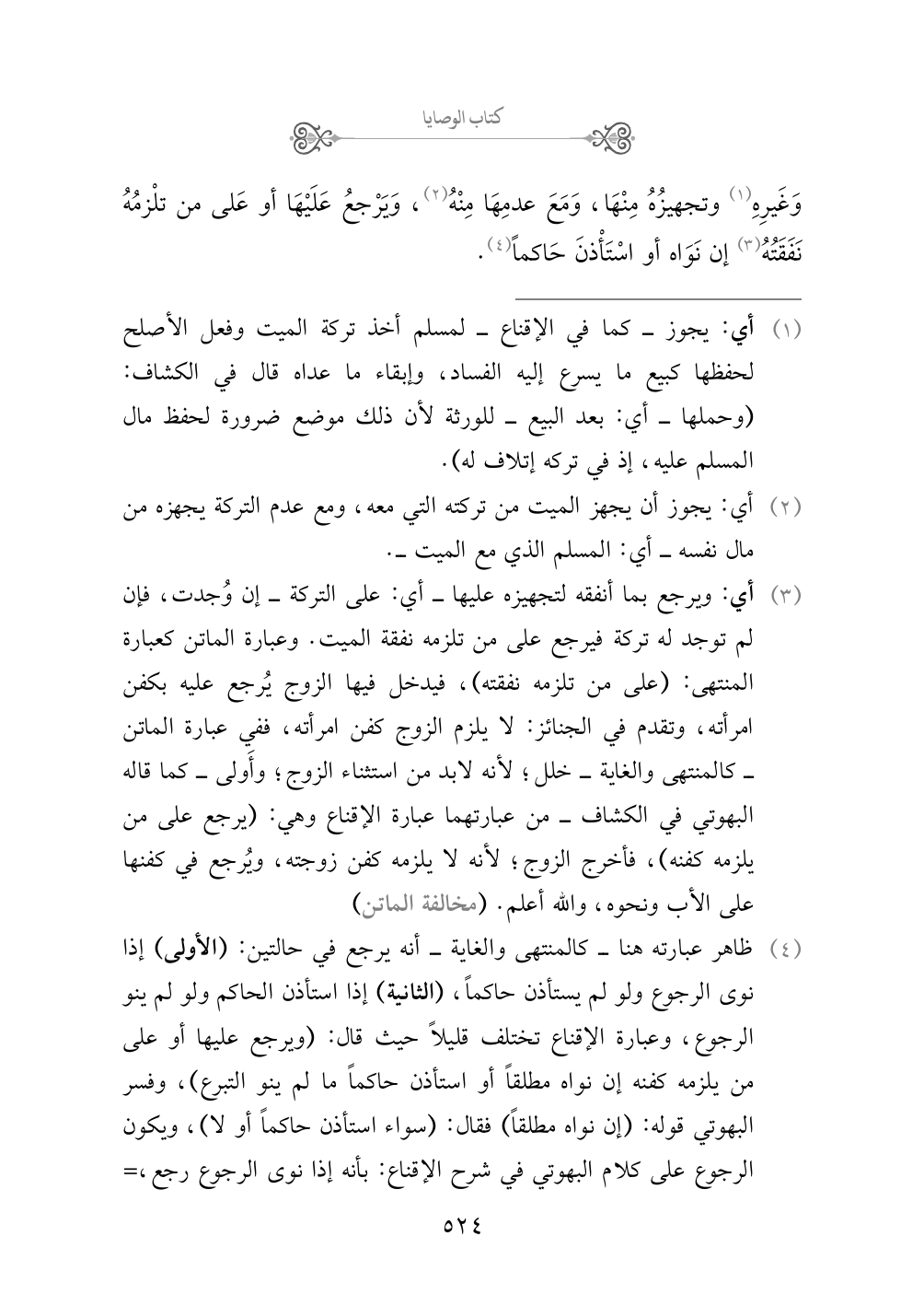 (¬٤) ظاهر عبارته هنا - كالمنتهى والغاية - أنه يرجع في حالتين: (الأولى) إذا نوى الرجوع ولو لم يستأذن حاكماً، (الثانية) إذا استأذن الحاكم ولو لم ينو الرجوع، وعبارة الإقناع تختلف قليلاً حيث قال: (ويرجع عليها أو على من يلزمه كفنه إن نواه مطلقاً أو استأذن حاكماً ما لم ينو التبرع)، وفسر البهوتي قوله: (إن نواه مطلقاً) فقال: (سواء استأذن حاكماً أو لا)، ويكون الرجوع على كلام البهوتي في شرح الإقناع: بأنه إذا نوى الرجوع رجع، سواء استأذن الحاكم أو لم يستأذنه، وكذلك يرجع إن استأذن الحاكم بشرط نية الرجوع، فنية الرجوع لابد منها، فإن لم ينو الرجوع مع استئذان الحاكم فلا يرجع، وهو قياس مسألة (من قام عن غيره بدين واجب) ففيها لا يرجع إلا إذا نوى الرجوع، كذا حققه البهوتي في كشاف القناع، وهو أَولى مما يظهر من عبارتهم. والله أعلم. (بحث)