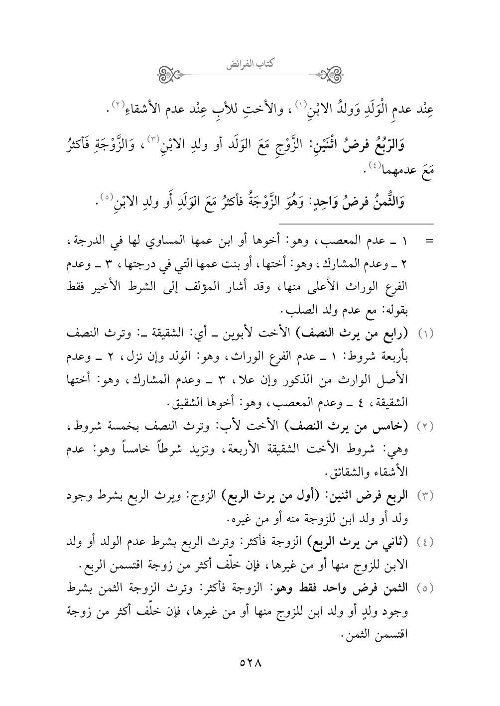 (¬١) (رابع من يرث النصف) الأخت لأبوين - أي: الشقيقة -: وترث النصف بأربعة شروط: ١ - عدم الفرع الوراث، وهو: الولد وإن نزل، ٢ - وعدم الأصل الوارث من الذكور وإن علا، ٣ - وعدم المشارك، وهو: أختها الشقيقة، ٤ - وعدم المعصب، وهو: أخوها الشقيق.