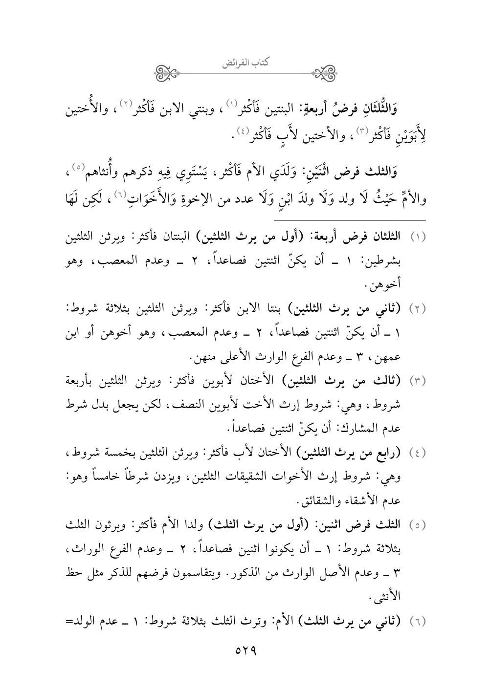 (¬١) الثلثان فرض أربعة: (أول من يرث الثلثين) البنتان فأكثر: ويرثن الثلثين بشرطين: ١ - أن يكنّ اثنتين فصاعداً، ٢ - وعدم المعصب، وهو أخوهن.