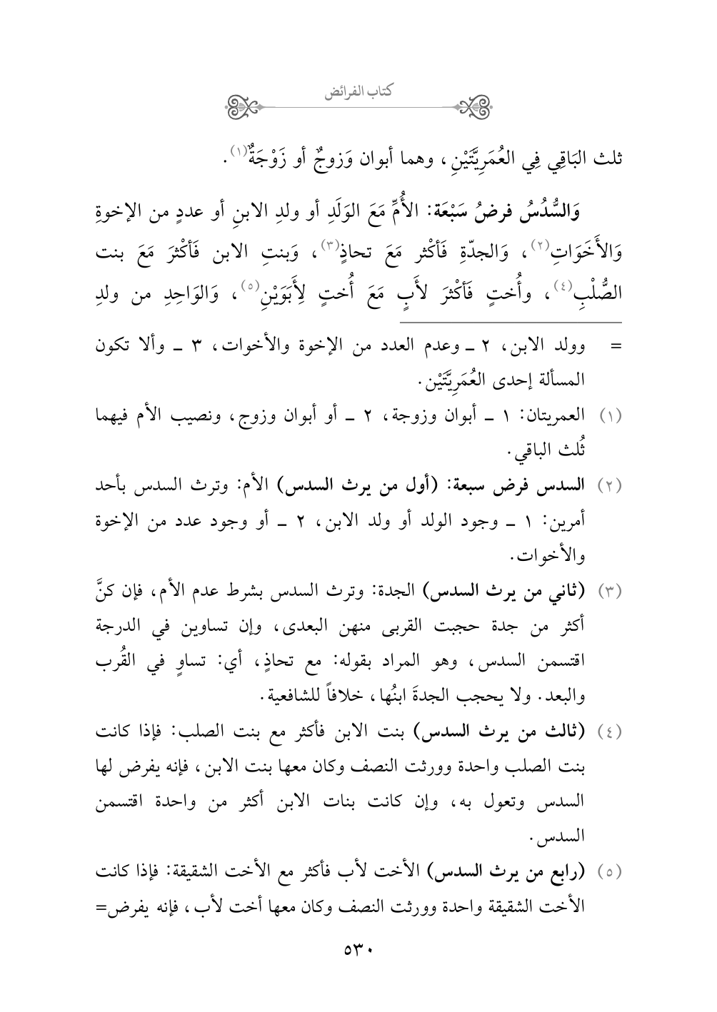 (¬١) العمريتان: ١ - أبوان وزوجة، ٢ - أو أبوان وزوج، ونصيب الأم فيهما ثُلث الباقي.