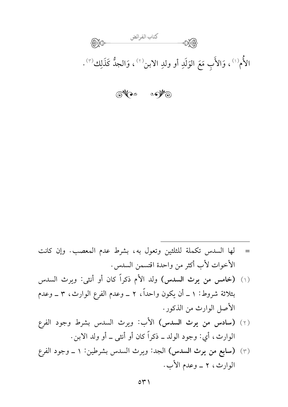 (¬٢) (سادس من يرث السدس) الأب: ويرث السدس بشرط وجود الفرع الوارث، أي: وجود الولد - ذكراً كان أو أنثى - أو ولد الابن.