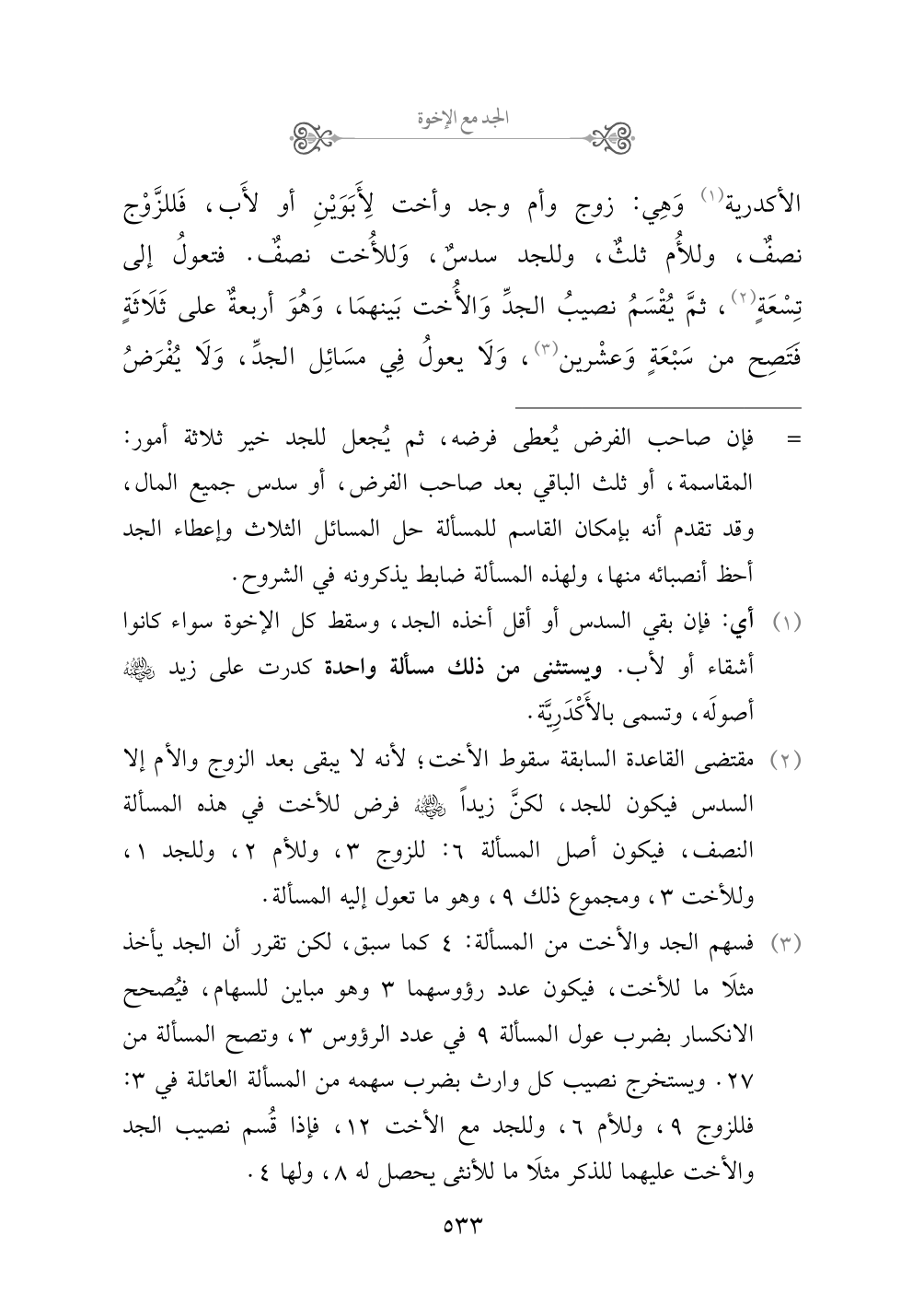 (¬٣) فسهم الجد والأخت من المسألة: ٤ كما سبق، لكن تقرر أن الجد يأخذ مثلَا ما للأخت، فيكون عدد رؤوسهما ٣ وهو مباين للسهام، فيُصحح الانكسار بضرب عول المسألة ٩ في عدد الرؤوس ٣، وتصح المسألة من ٢٧. ويستخرج نصيب كل وارث بضرب سهمه من المسألة العائلة في ٣: فللزوج ٩، وللأم ٦، وللجد مع الأخت ١٢، فإذا قُسم نصيب الجد والأخت عليهما للذكر مثلَا ما للأنثى يحصل له ٨، ولها ٤.