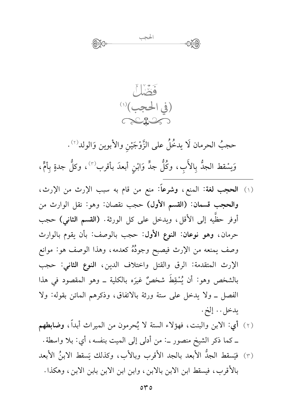 (¬١) الحجب لغة: المنع، وشرعاً: منع من قام به سبب الإرث من الإرث، والحجب قسمان: (القسم الأول) حجب نقصان: وهو: نقل الوارث من أوفر حظَّيه إلى الأقل، ويدخل على كل الورثة. (القسم الثاني) حجب حرمان، وهو نوعان: النوع الأول: حجب بالوصف: بأن يقوم بالوارث وصف يمنعه من الإرث فيصبح وجودُهُ كعدمه، وهذا الوصف هو: موانع الإرث المتقدمة: الرق والقتل واختلاف الدين، النوع الثاني: حجب بالشخص وهو: أن يُسْقِطَ شخصٌ غيرَه بالكلية - وهو المقصود في هذا الفصل - ولا يدخل على ستة ورثة بالاتفاق، وذكرهم الماتن بقوله: ولا يدخل .. إلخ.