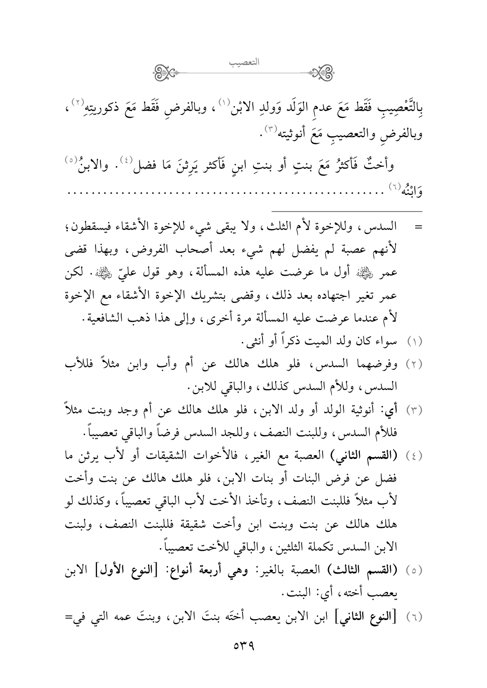 (¬٥) (القسم الثالث) العصبة بالغير: وهي أربعة أنواع: [النوع الأول] الابن يعصب أخته، أي: البنت.