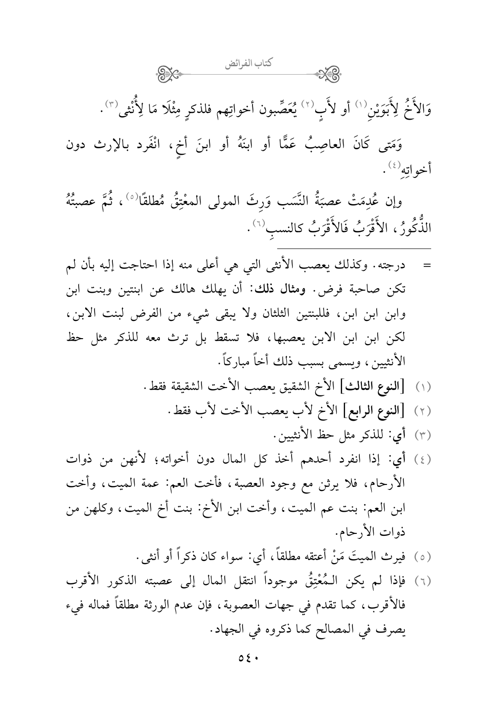 (¬٤) أي: إذا انفرد أحدهم أخذ كل المال دون أخواته؛ لأنهن من ذوات الأرحام، فلا يرثن مع وجود العصبة، فأخت العم: عمة الميت، وأخت ابن العم: بنت عم الميت، وأخت ابن الأخ: بنت أخ الميت، وكلهن من ذوات الأرحام.