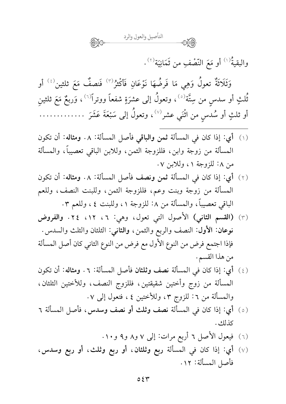 (¬١) أي: إذا كان في المسألة ثمن والباقي فأصل المسألة: ٨. ومثاله: أن تكون المسألة من زوجة وابن، فللزوجة الثمن، وللابن الباقي تعصيباً، والمسألة من ٨: للزوجة ١، وللابن ٧.