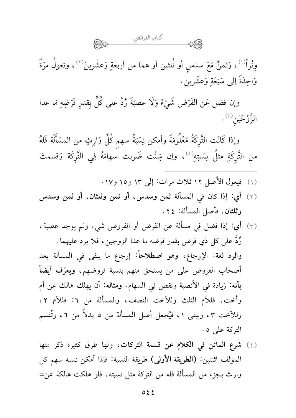 (¬٣) أي: إذا فضل في مسألة عن الفرض أو الفروض شيء ولم يوجد عصبة، رُدَّ على كل ذي فرض بقدر فرضه ما عدا الزوجين، فلا يرد عليهما.