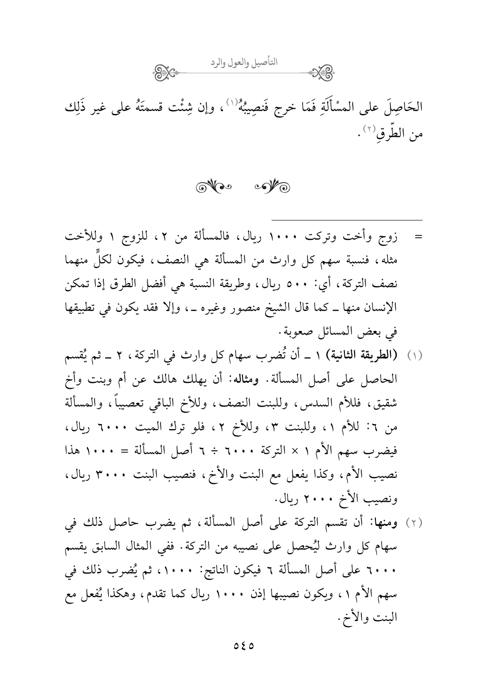 (¬١) (الطريقة الثانية) ١ - أن تُضرب سهام كل وارث في التركة، ٢ - ثم يُقسم الحاصل على أصل المسألة. ومثاله: أن يهلك هالك عن أم وبنت وأخ شقيق، فللأم السدس، وللبنت النصف، وللأخ الباقي تعصيباً، والمسألة من ٦: للأم ١، وللبنت ٣، وللأخ ٢، فلو ترك الميت ٦٠٠٠ ريال، فيضرب سهم الأم ١ × التركة ٦٠٠٠ ÷ ٦ أصل المسألة = ١٠٠٠ هذا نصيب الأم، وكذا يفعل مع البنت والأخ، فنصيب البنت ٣٠٠٠ ريال، ونصيب الأخ ٢٠٠٠ ريال.
