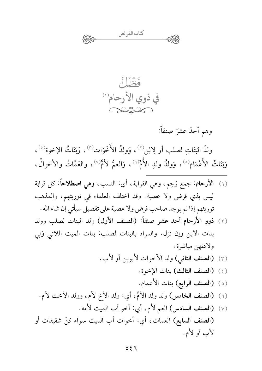 (¬١) الأرحام: جمع رَحِم، وهي القرابة، أي: النسب، وهي اصطلاحاً: كل قرابة ليس بذي فرض ولا عصبة. وقد اختلف العلماء في توريثهم، والمذهب توريثهم إذا لم يوجد صاحب فرض ولا عصبة على تفصيل سيأتي إن شاء الله.