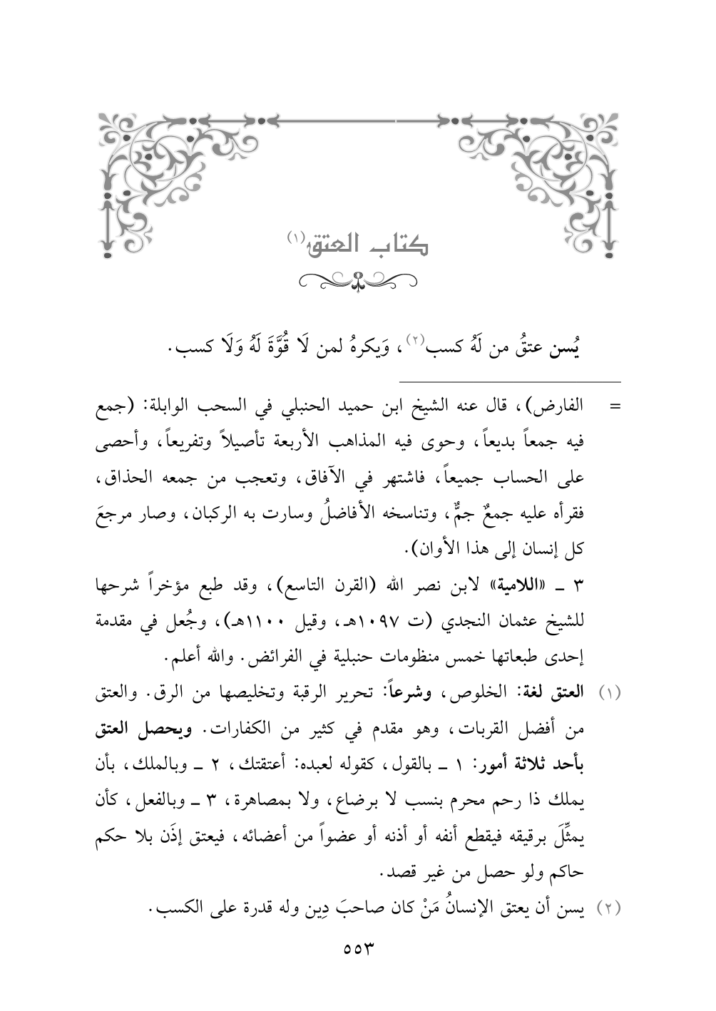(¬١) العتق لغة: الخلوص، وشرعاً: تحرير الرقبة وتخليصها من الرق. والعتق من أفضل القربات، وهو مقدم في كثير من الكفارات. ويحصل العتق بأحد ثلاثة أمور: ١ - بالقول، كقوله لعبده: أعتقتك، ٢ - وبالملك، بأن يملك ذا رحم محرم بنسب لا برضاع، ولا بمصاهرة، ٣ - وبالفعل، كأن يمثِّلَ برقيقه فيقطع أنفه أو أذنه أو عضواً من أعضائه، فيعتق إذَن بلا حكم حاكم ولو حصل من غير قصد.