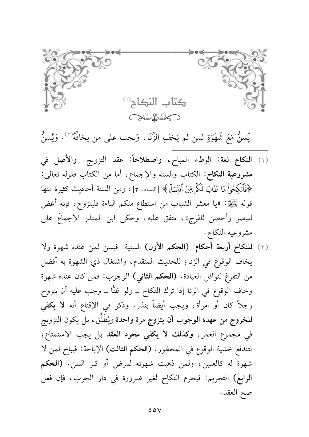 (¬٢) للنكاح أربعة أحكام: (الحكم الأول) السنية: فيسن لمن عنده شهوة ولا يخاف الوقوع في الزنا؛ للحديث المتقدم، واشتغال ذي الشهوة به أفضل من التفرغ لنوافل العبادة. (الحكم الثاني) الوجوب: فمن كان عنده شهوة وخاف الوقوع في الزنا إذا ترك النكاح - ولو ظنًّا - وجب عليه أن يتزوج رجلاً كان أو امرأة، ويجب أيضاً بنذر. وذكر في الإقناع أنه لا يكفي للخروج من عهدة الوجوب أن يتزوج مرة واحدة ويُطَلِّق، بل يكون التزويج في مجموع العمر، وكذلك لا يكفي مجرد العقد بل يجب الاستمتاع؛ لتندفع خشية الوقوع في المحظور. (الحكم الثالث) الإباحة: فيباح لمن لا شهوة له كالعنين، ولمن ذهبت شهوته لمرض أو كبر السن. (الحكم الرابع) التحريم: فيحرم النكاح لغير ضرورة في دار الحرب، فإن فعل صح العقد.