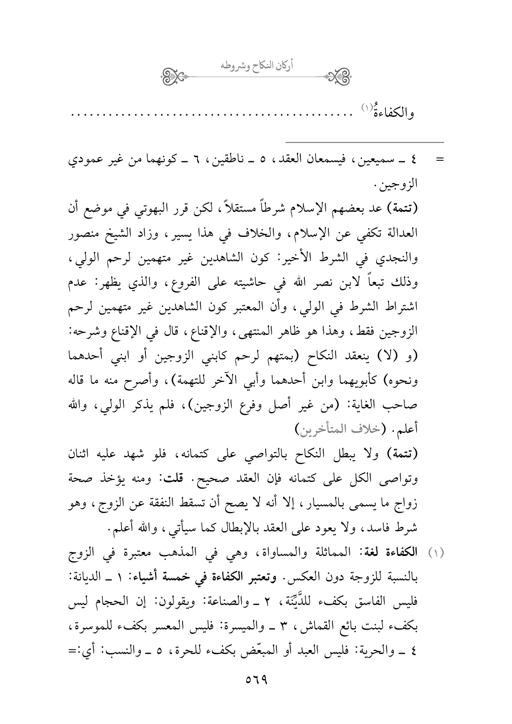 (¬١) الكفاءة لغة: المماثلة والمساواة، وهي في المذهب معتبرة في الزوج بالنسبة للزوجة دون العكس. وتعتبر الكفاءة في خمسة أشياء: ١ - الديانة: فليس الفاسق بكفء للدَّيِّنَة، ٢ - والصناعة: ويقولون: إن الحجام ليس بكفء لبنت بائع القماش، ٣ - والميسرة: فليس المعسر بكفء للموسرة، ٤ - والحرية: فليس العبد أو المبعّض بكفء للحرة، ٥ - والنسب: أي: شرف النسب، فليس غير النسيب بكفء لشريفة النسب، وليس غير العربي بكفء للعربية. وكل عربي كفء للعربية ولو قرشية، وسائر الناس - أي: العجم كالرومي والأمريكي - بعضهم أكفاء بعض.